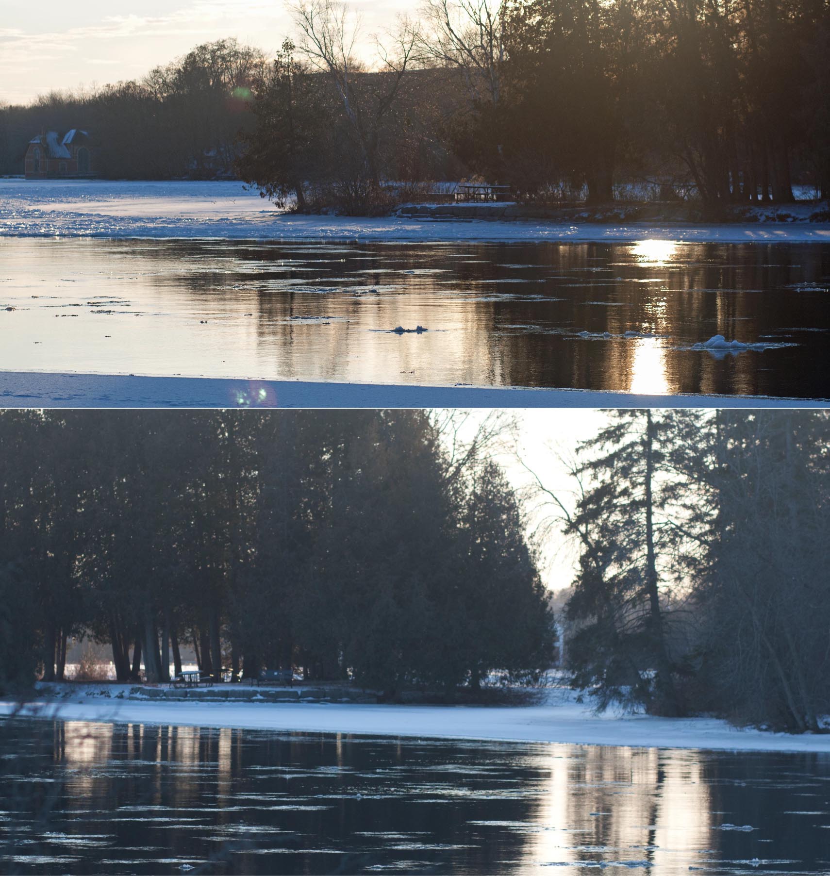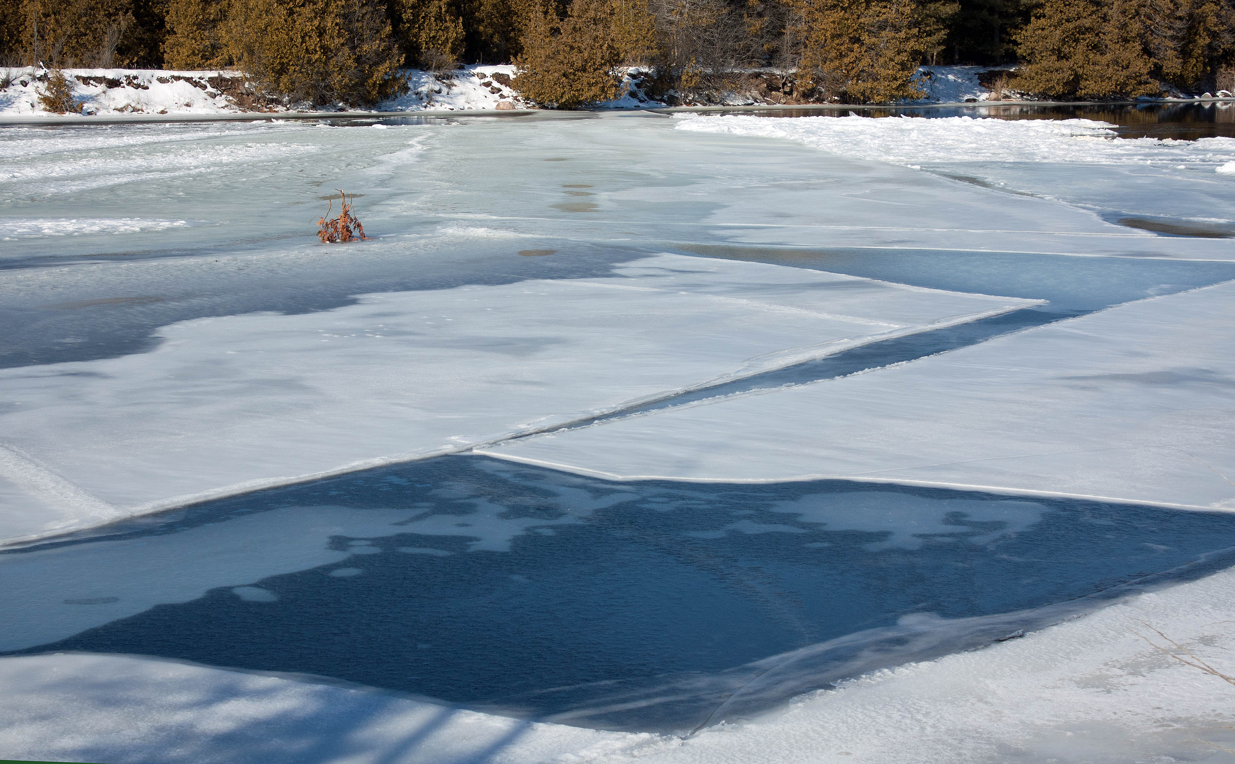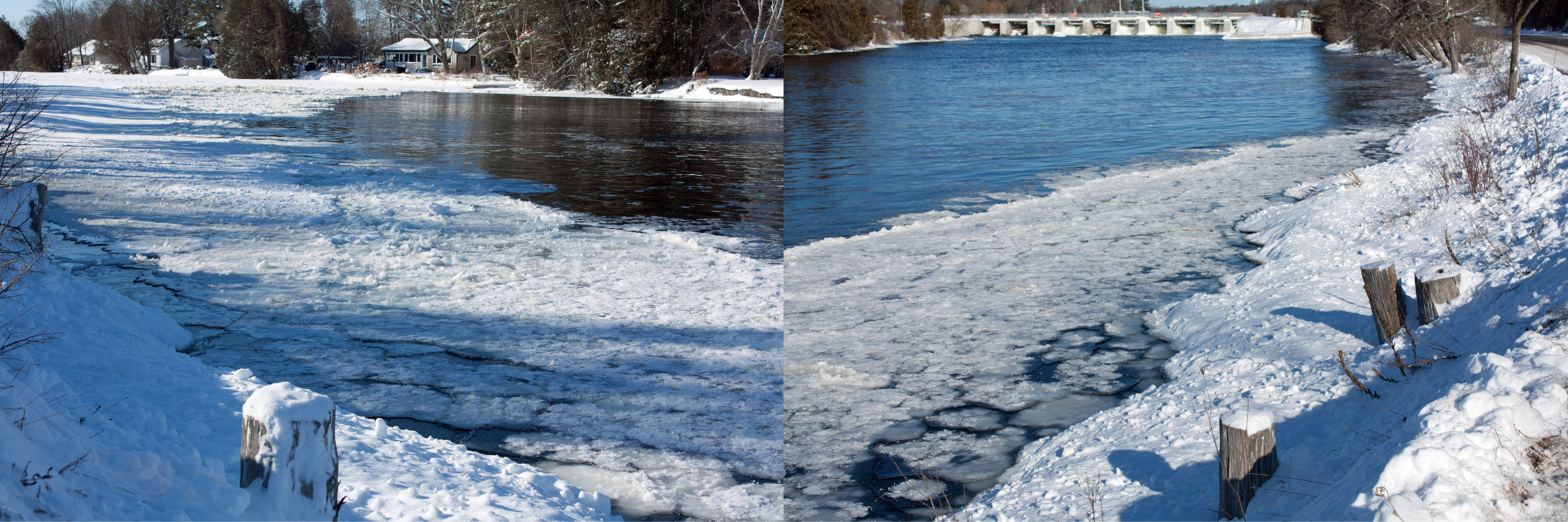 Two things determine how ice forms: temperature and turbulence. The Otonabee experiences below freezing air temperatures for close to five months of the year and is both turbulent and calm in various places and times based on its level changes. This makes for some varied and interesting ice phenomena.