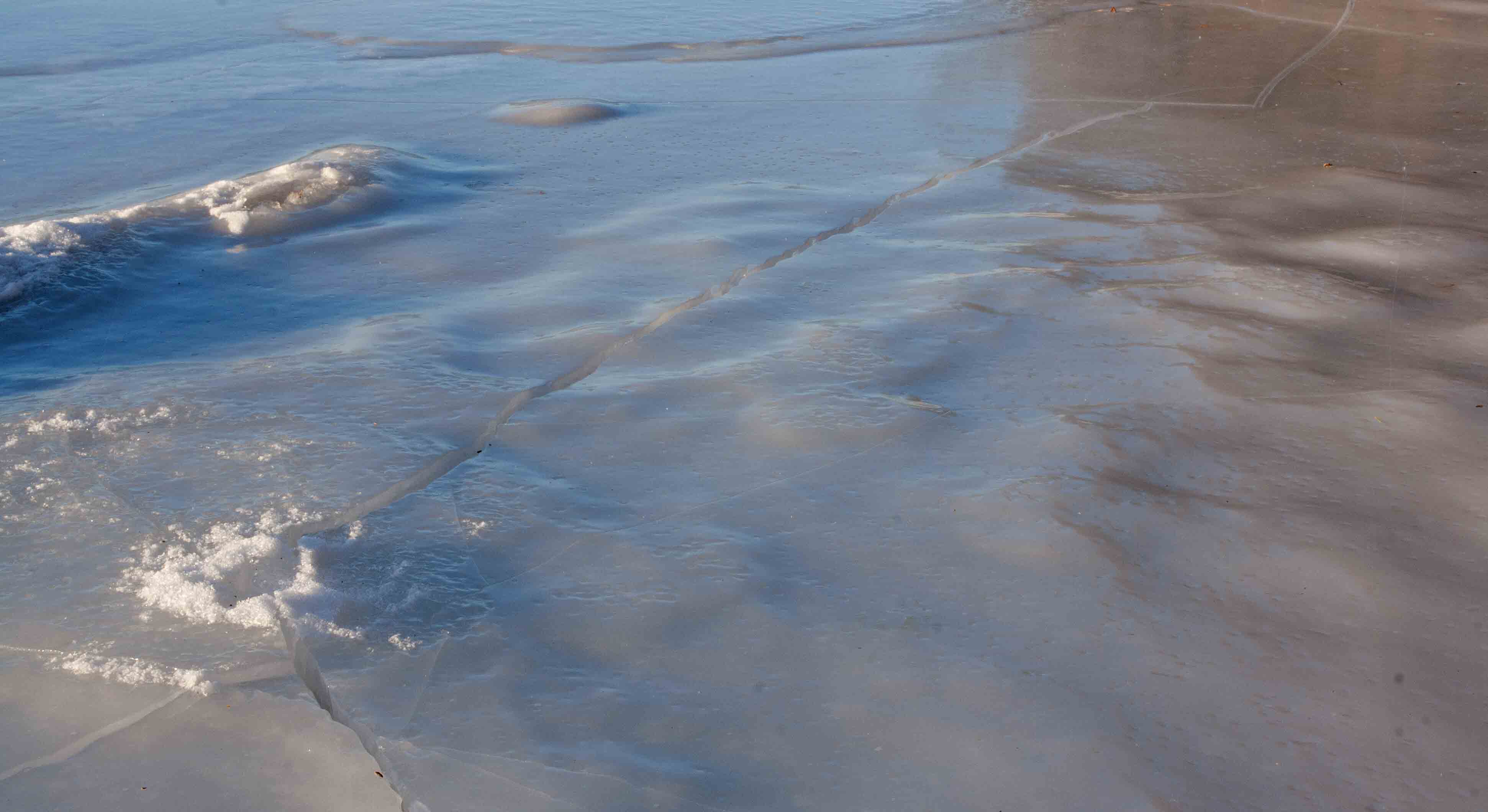 On a quiet surface with little wind, such as a protected bay or pond, clear ice forms in very cold weather. Transparent ice may resemble Goethe glass and reflect light like clear water. John A. Downing, director of The University of Minnesota Sea Grant tells us that this “primary ice” is crystalline and composed of hexagonal plates, needles, or sheath-like structures with large crystals oriented up and down. It can be transparent, like glass, or slightly cloudy, reflecting a deep or aqua-turquoise blue, depending on the materials the crystals nucleate on. When the ice cover expands from the shore to the entire river or lake, it’s called fast ice because it’s held fast by the shore.