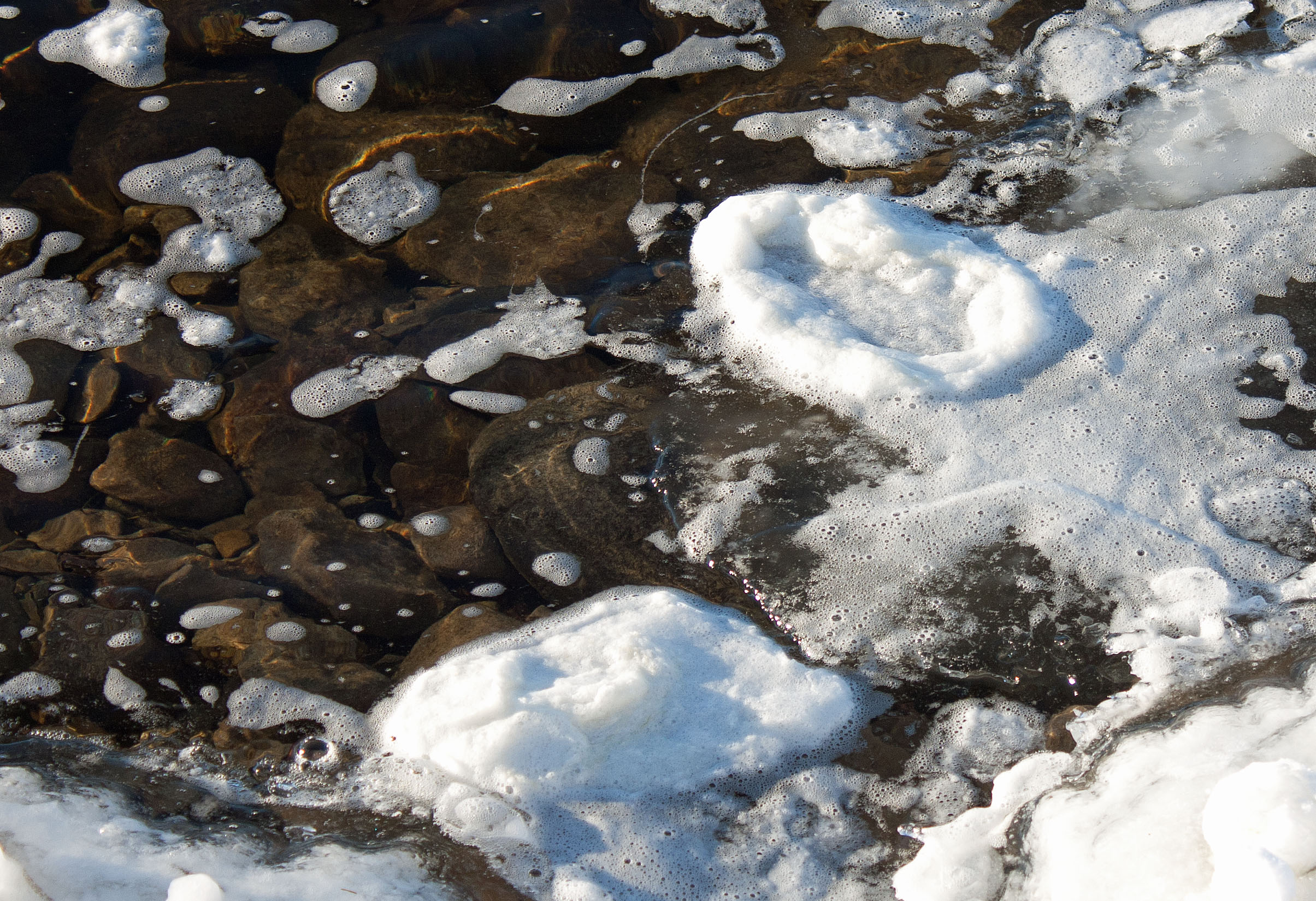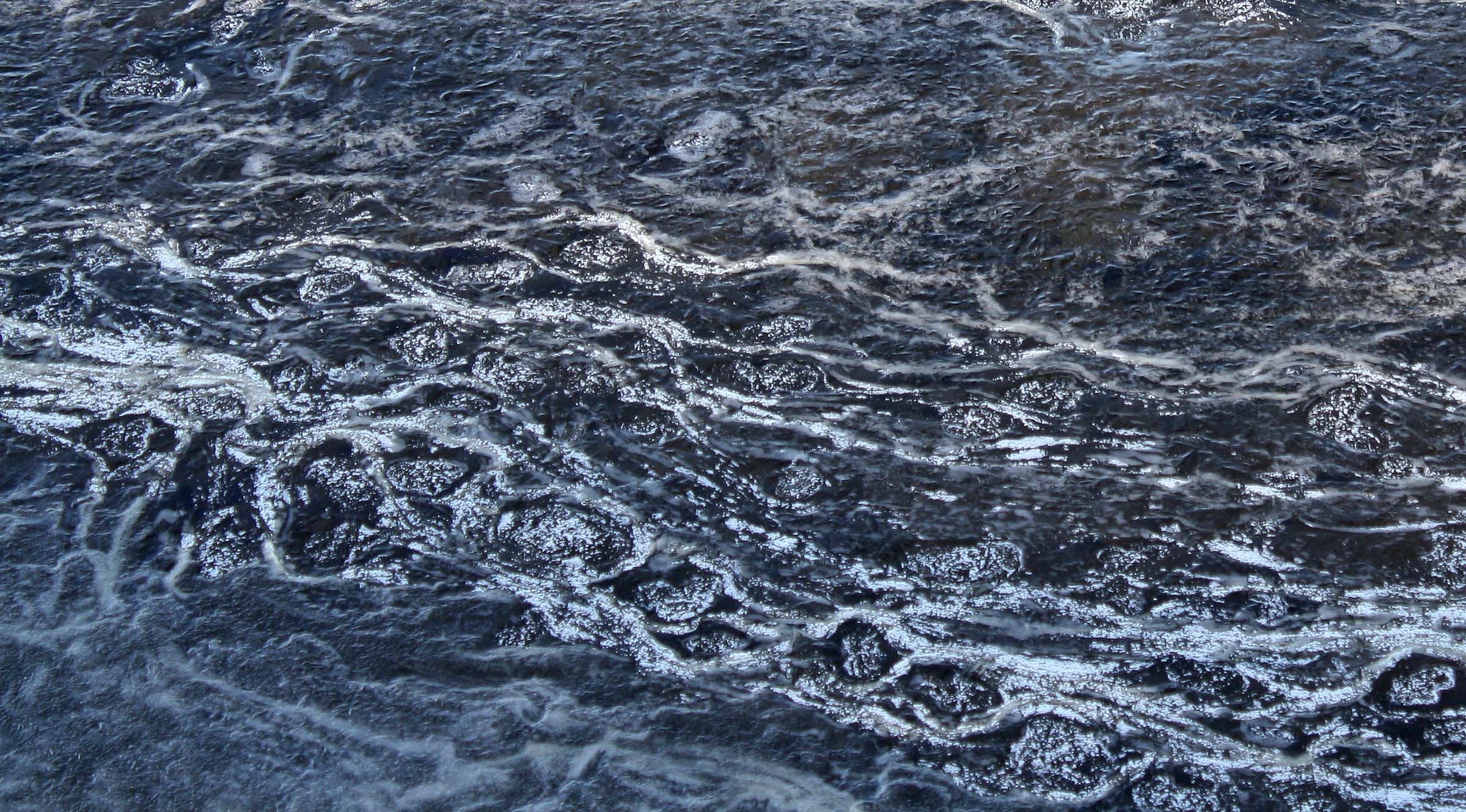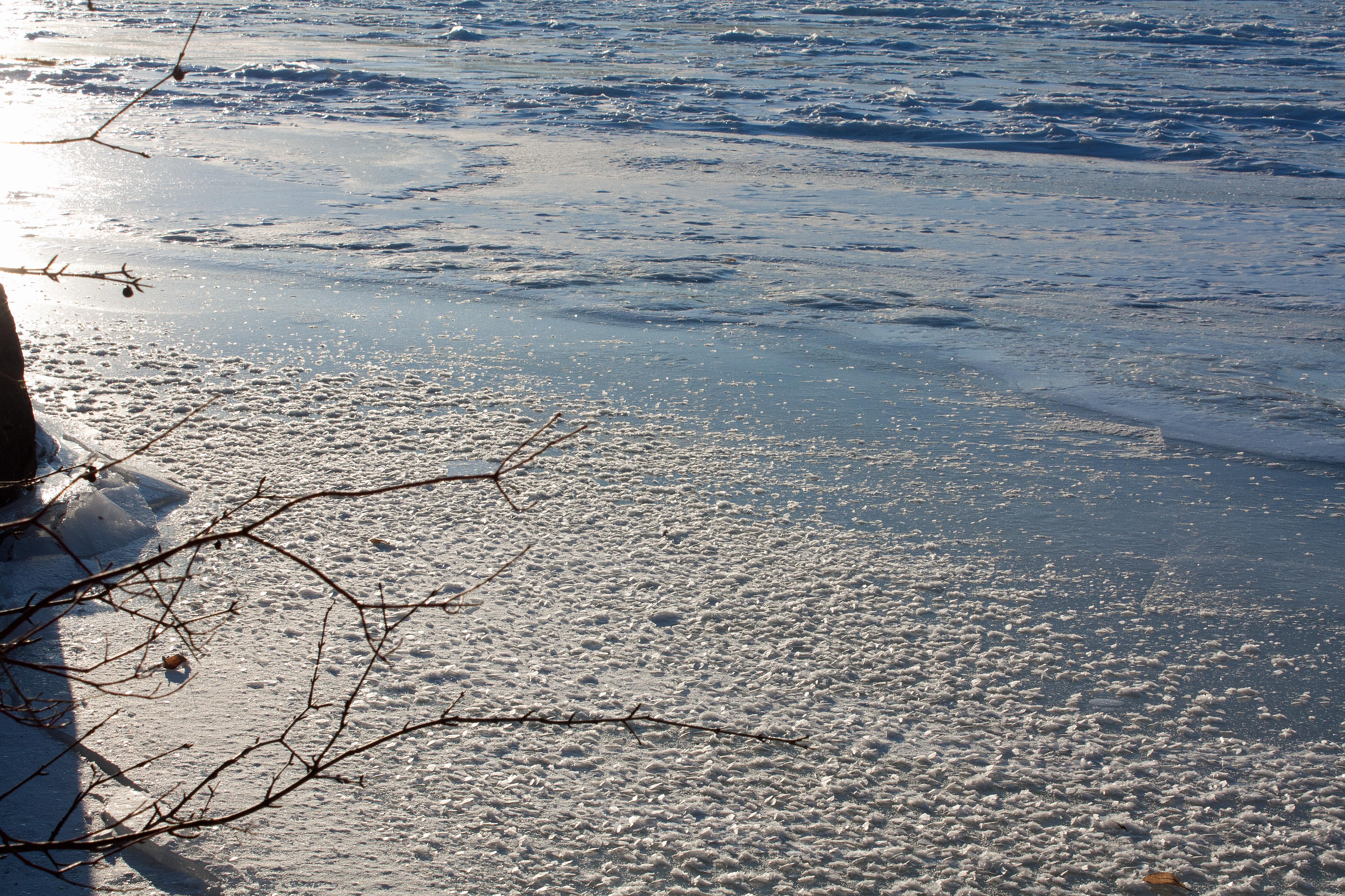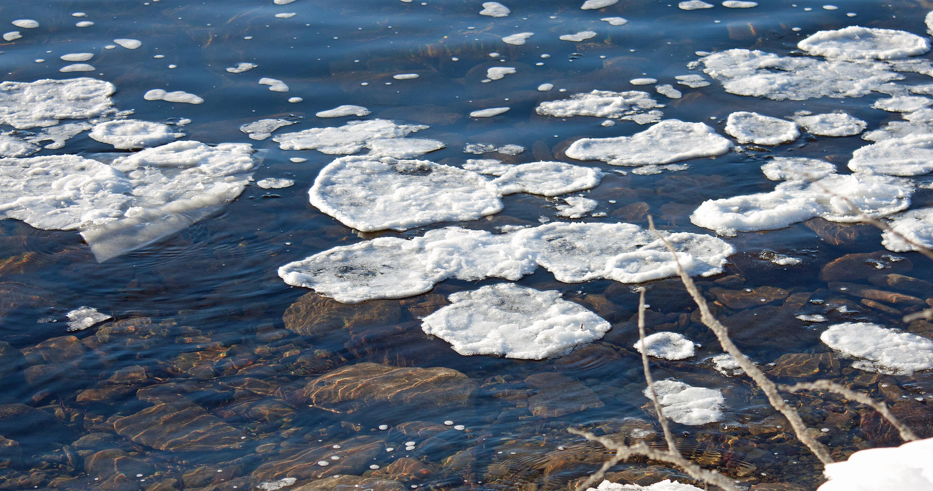 As early as November, when it’s freezing cold and water supercools, ice crystals (frazil ice) form and mix into the waterbody’s upper layer. The process can be accelerated when snow falls on the waterbody, contributing ice crystals and often creating grease ice. The ice molecules expand into an organized latticework that is less dense and lighter than liquid water, allowing it to float. Frazil ice often develops into slushy clumps of white ice a few centimeters across (grease ice or slushy, spongy grease ice called shuga).