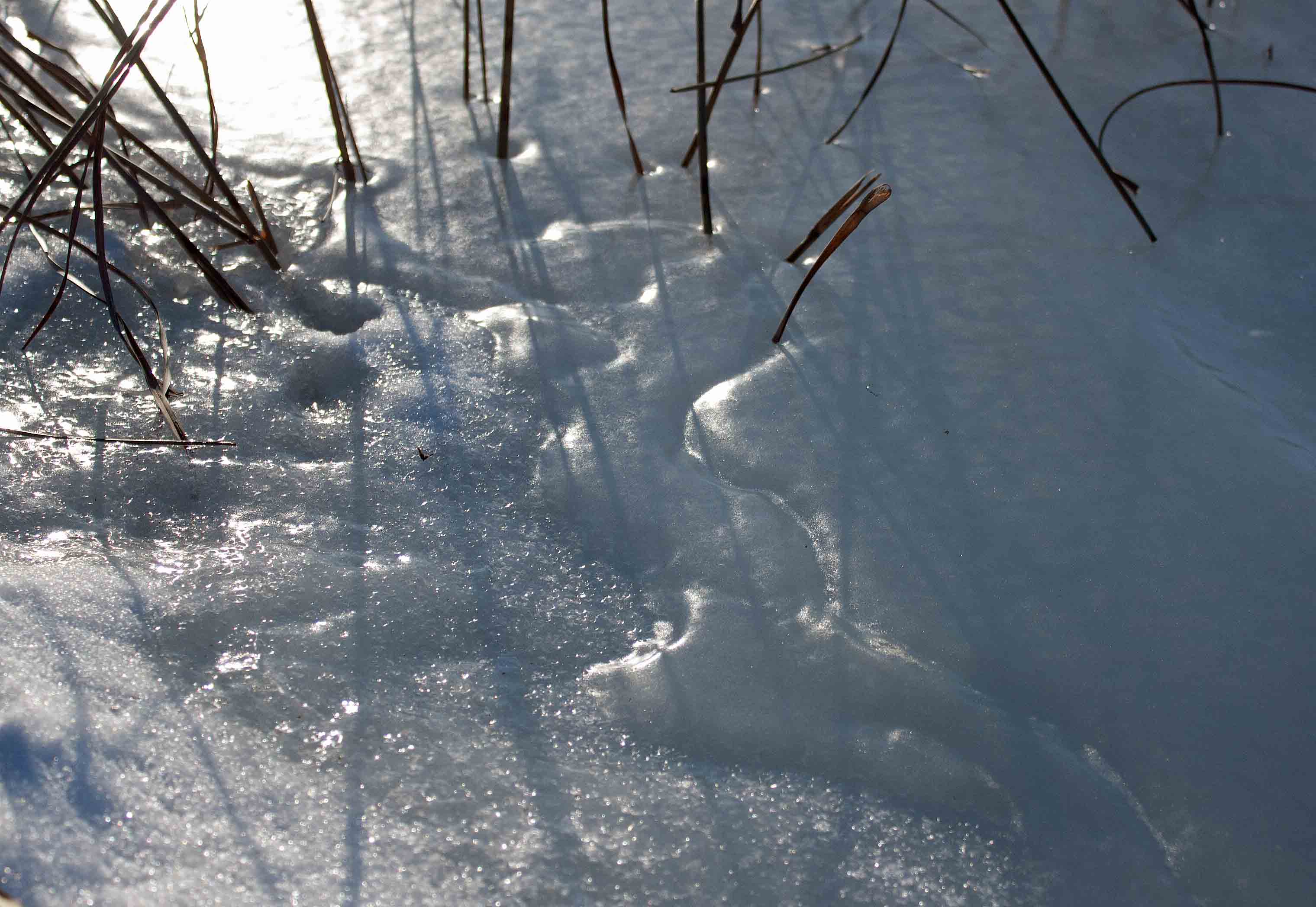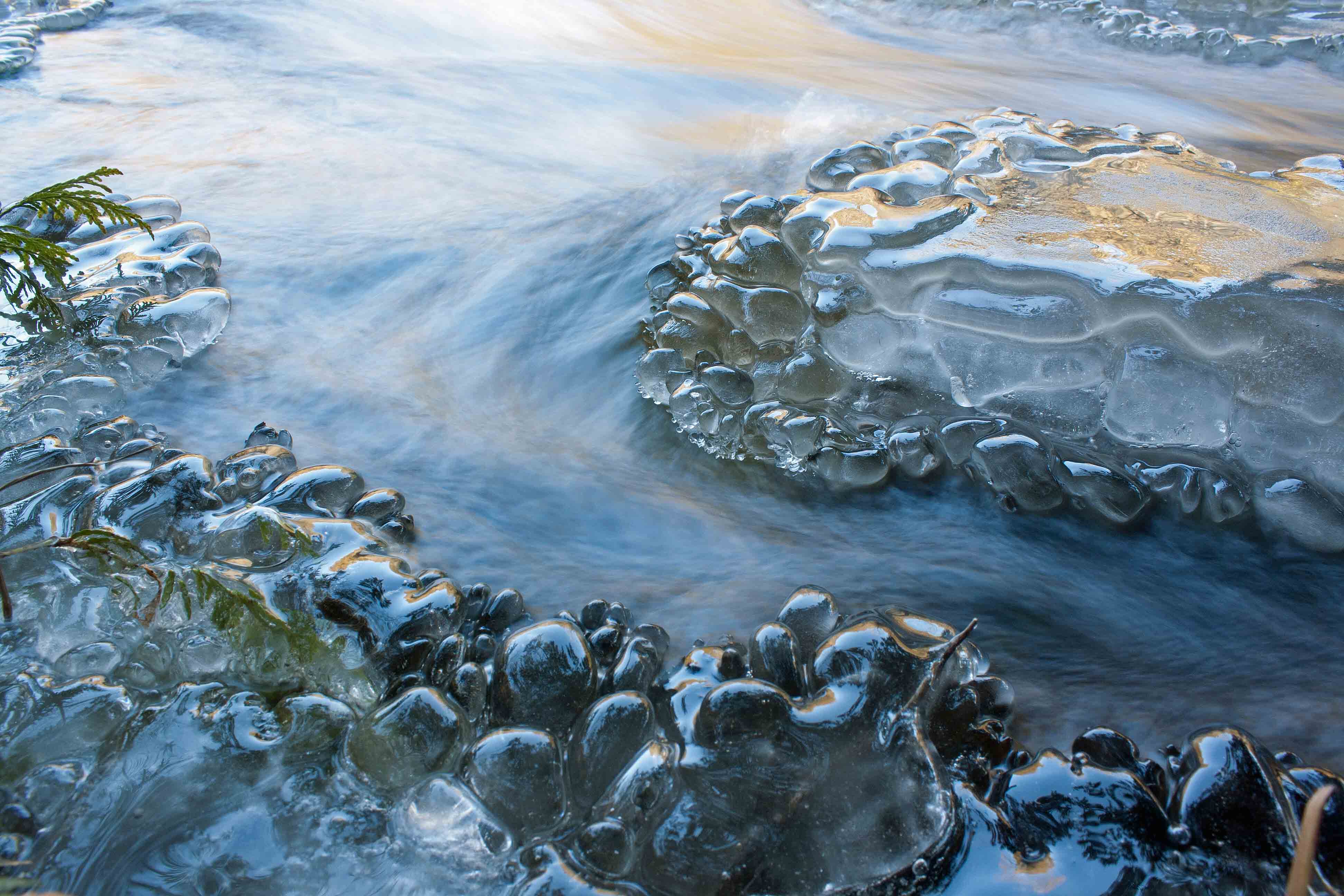 Ice rind is a brittle shiny crust of ice that forms on a quiet surface by direct freezing or from grease ice. Ice rind is quite thin, from 1 to 5 cm thick, and easily breaks with wind action or water swells, usually in rectangular pieces. I saw several larger pieces drifting between dams, colliding and rafting over each other and eventually finding themselves consolidated into a downstream ice jam above another dam. Rind ice is best seen suspended in a crispy film around marsh reeds when the water level of the river goes down. Then the brittle ice breaks off into pieces, leaving various river vegetation and rocks with ice collars. I’ve also seen beautifully sculpted ice shapes that have formed on exposed rocks in Jackson Creek as the turbulent creek flows around them. ice sculptures resembling clear pearls or steps into heaven shone like jewels in the sunlight.