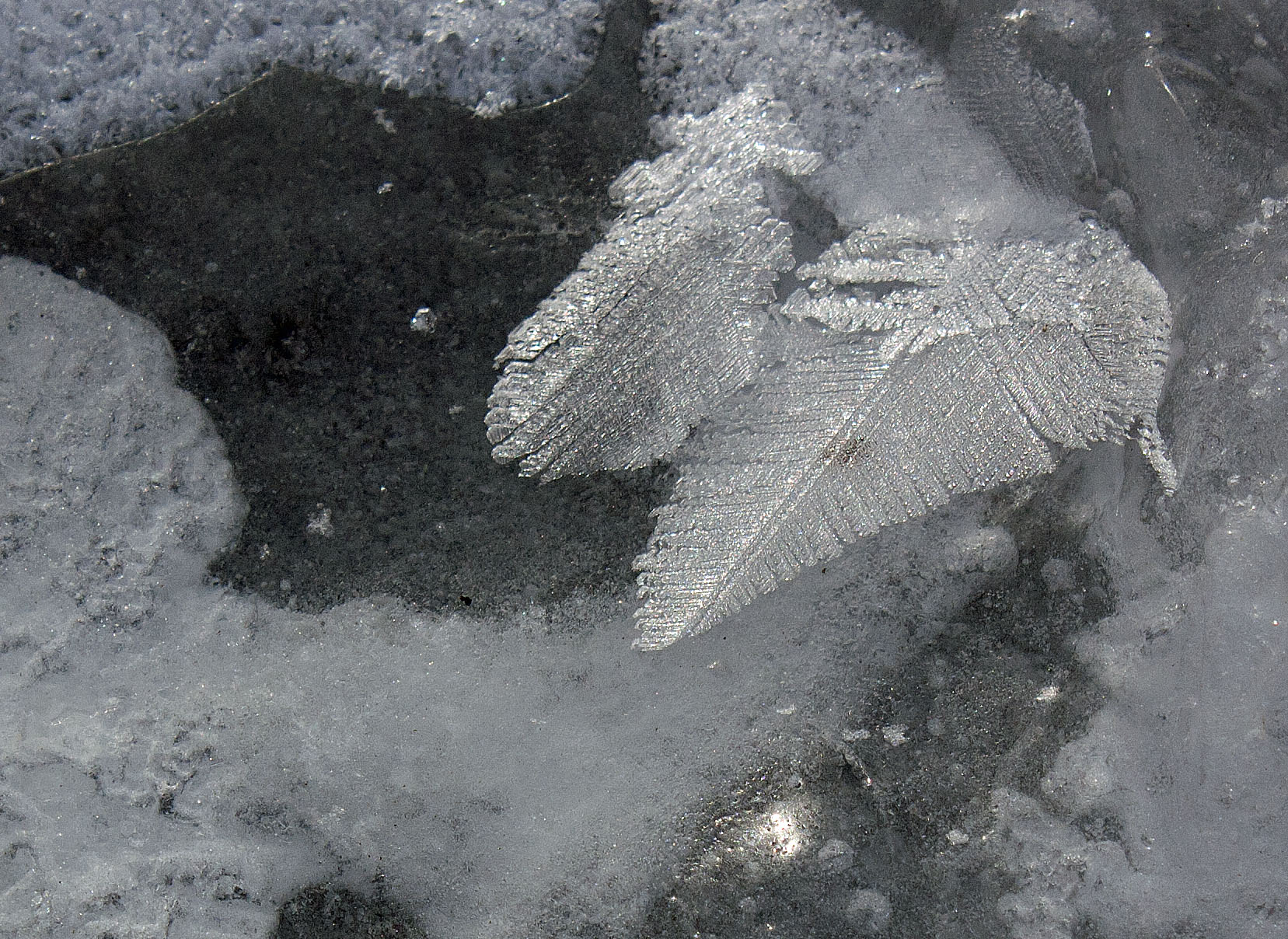 Frost crystals that form directly on cold surfaces such as a snow surface or an ice sheet from freezing water vapor grow larger and flower into beautiful leaf-like shapes or hexagonal snowflakes. The different frost shapes and patterns arise from the topography of the ice sheet, often specks of dust, salt, or residue, twigs and other organic material that lies on the surface.