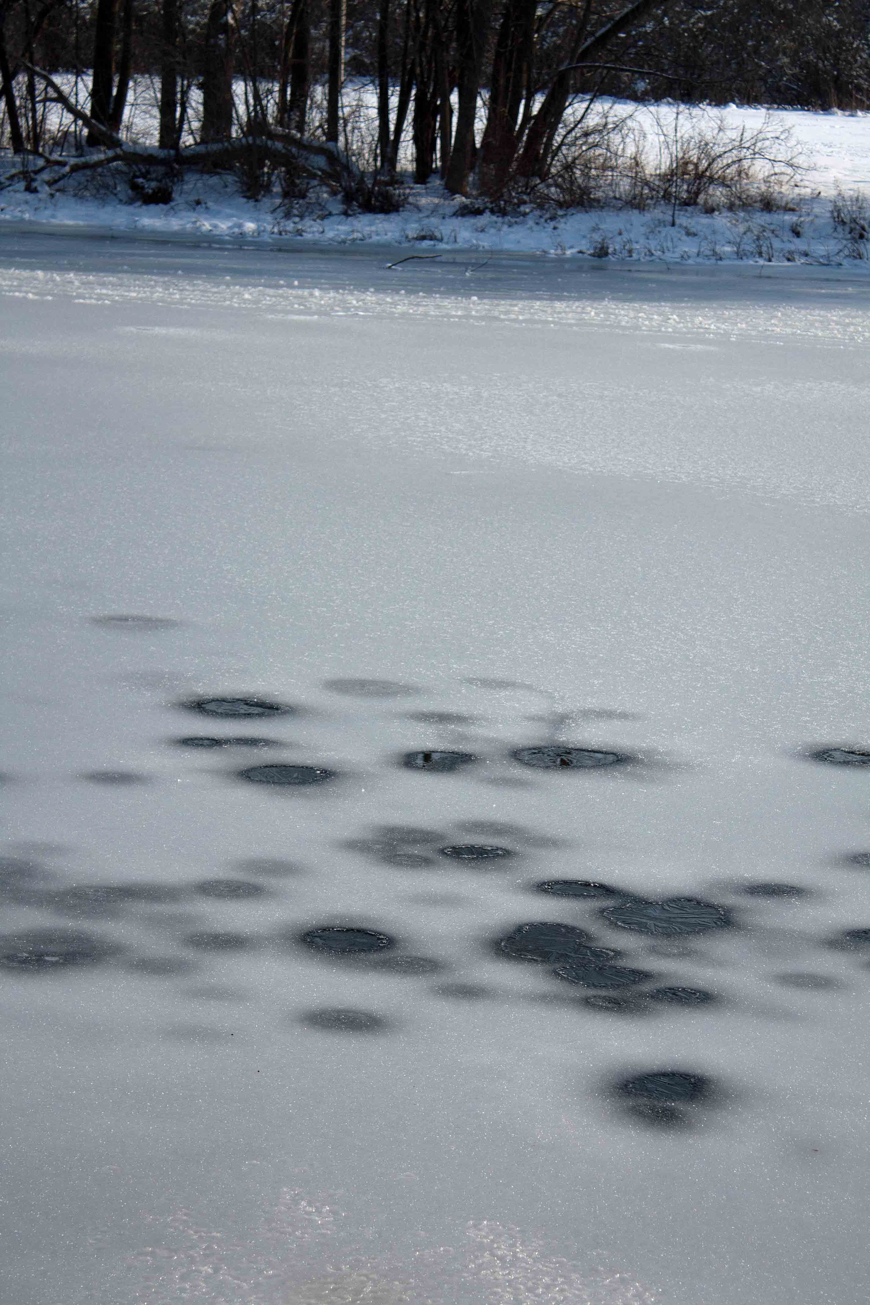Pancake Ice is ice that spins around in waves and thickens into free-floating ice disks. It forms particularly where the turbulence of rough water and rapids affect slush or ice rind, just downstream of a dam. This is exactly where I’ve seen pancake ice of varying sizes on the Otonabee River (pancakes from as small as 4-centimetres to as large as 3-metres wide and up to 10 cm thick). These were particularly noticeable below the dam associated with Lock 23.