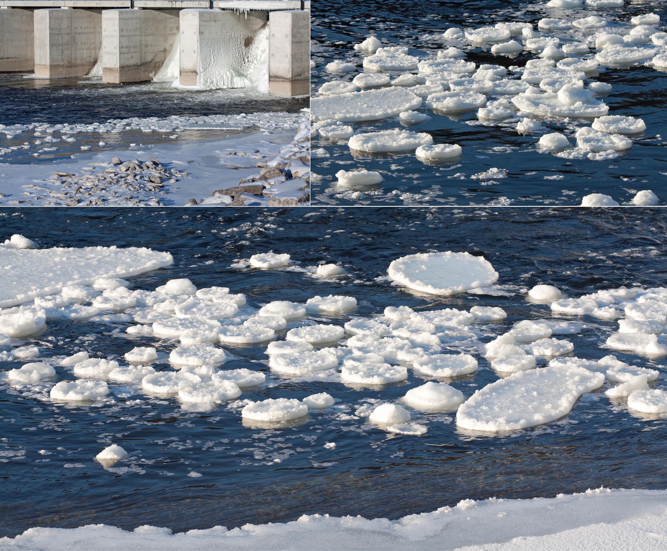 The rims of pancake ice are often turned up; when the pancakes collide into each other like bumper cars, frazil ice or slush piles onto their edges. According to Alberto Reyes (Northern landscape and climate change expert with the University of Alberta), ice pancakes “also like to glom onto infrastructure,” such as intakes to hydroelectric facilities; these affect power generation and outflow pipes that potentially block discharge pipes and cause flooding. The City of Peterborough has often had to issue a flood watch due to frazil ice accumulation.