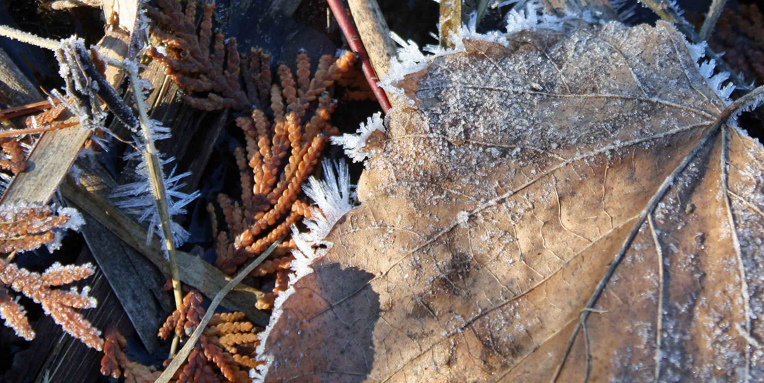 Morning rime frost forms on leaf edges and sticks on the ground in early winter in a freezing fog, ON (photo by Nina Munteanu)