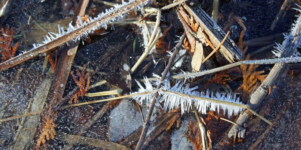On a calm clear and cold night, hoar frost will form. Hoar frost can resemble tiny frozen leaves or ferns, and typically forms on leaf edges, fence posts, and branches and buds of trees. It also forms on ice. Humid air will skip the droplet stage and go straight to crystallizing. When the sky is clear, the temperature can quickly drop since there are no clouds providing insulation. That’s when the magic of hoar frost happens and you wake up to the glitter of frost leaves. I recently found a bed of hoarfrost ‘flowers’ forming on the older ice of Thompson Creek marsh.
