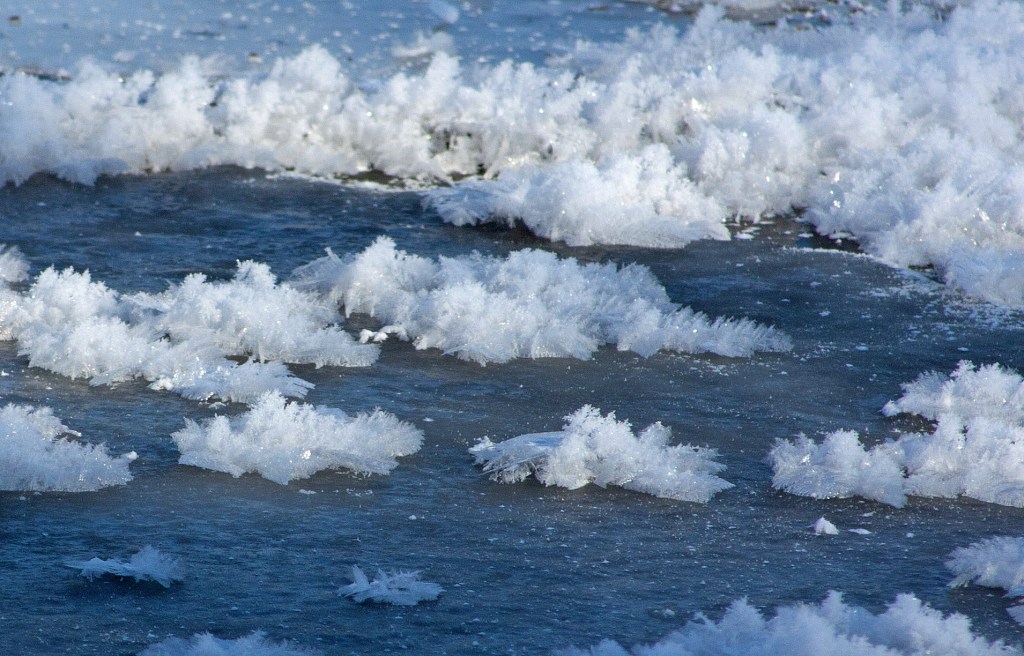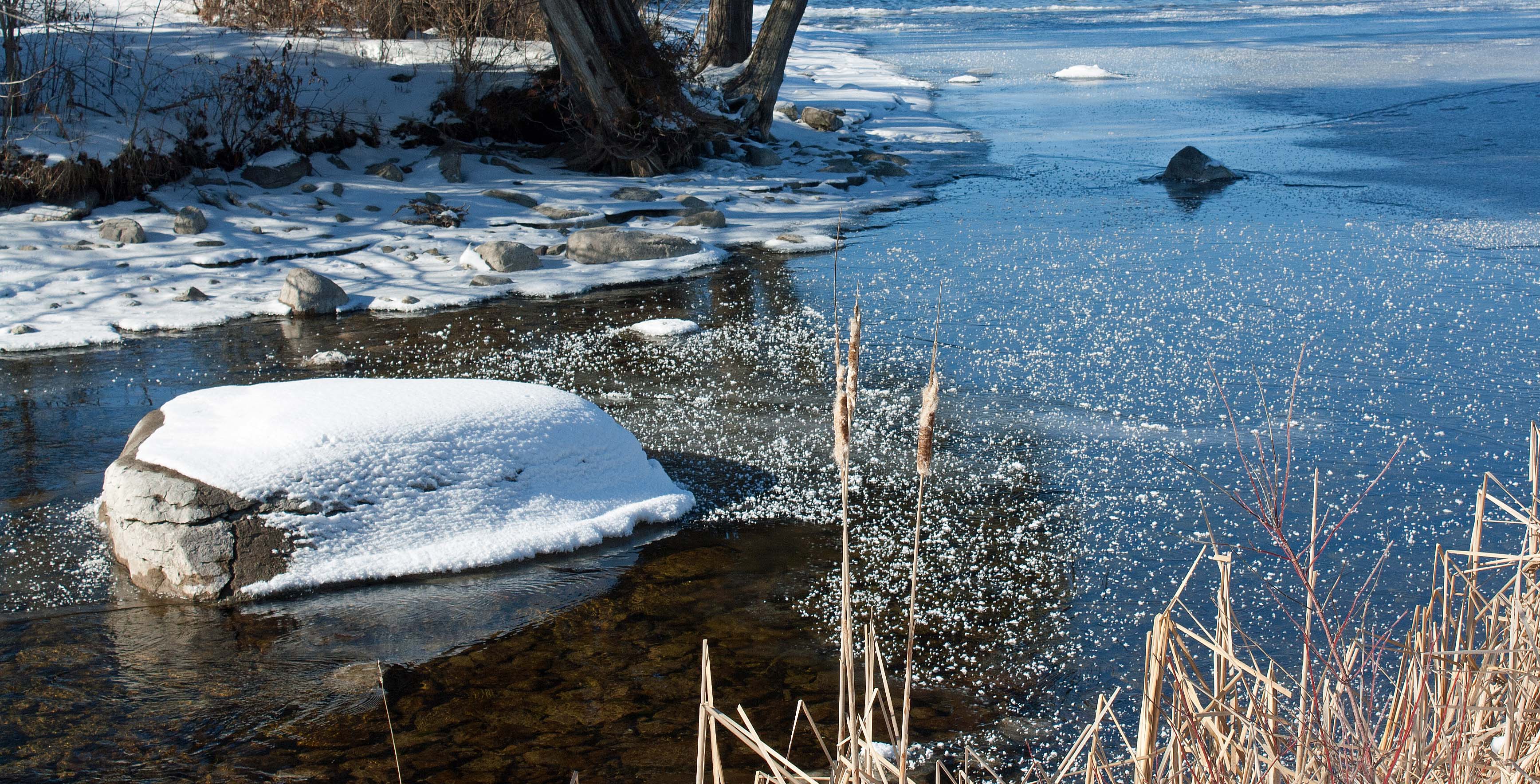 Clear ice on the Otonabee River is dusted with light fluffy freshly fallen graupel, ON (photo by Nina Munteanu)
