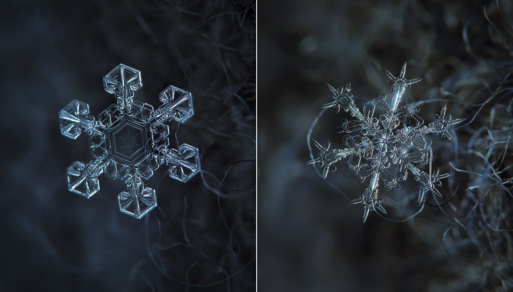 Stellar Plate (left) and Stellar Dendrite (right) snowflakes under microscope (photos by Alexey Kljatov)