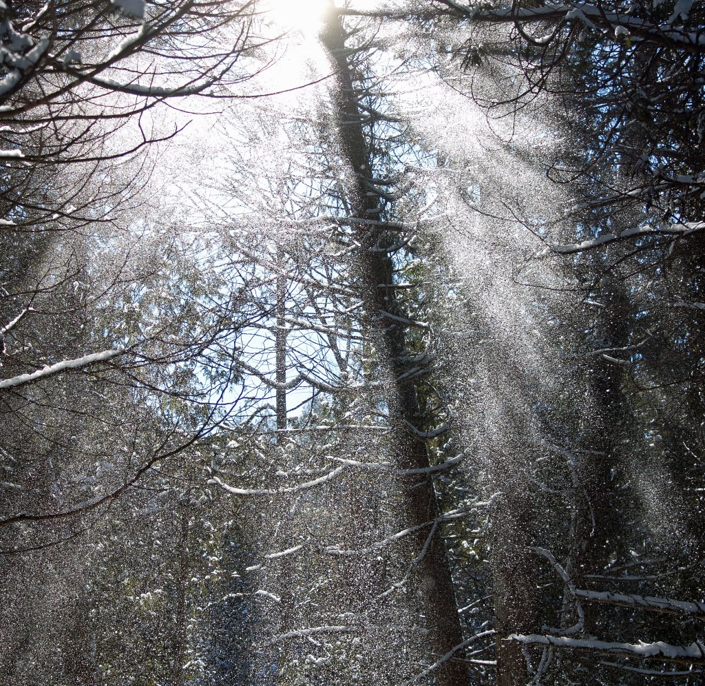 Snow dust on a bitter cold day in Jackson Creek Park among cedars, ON (photo by Nina Munteanu)