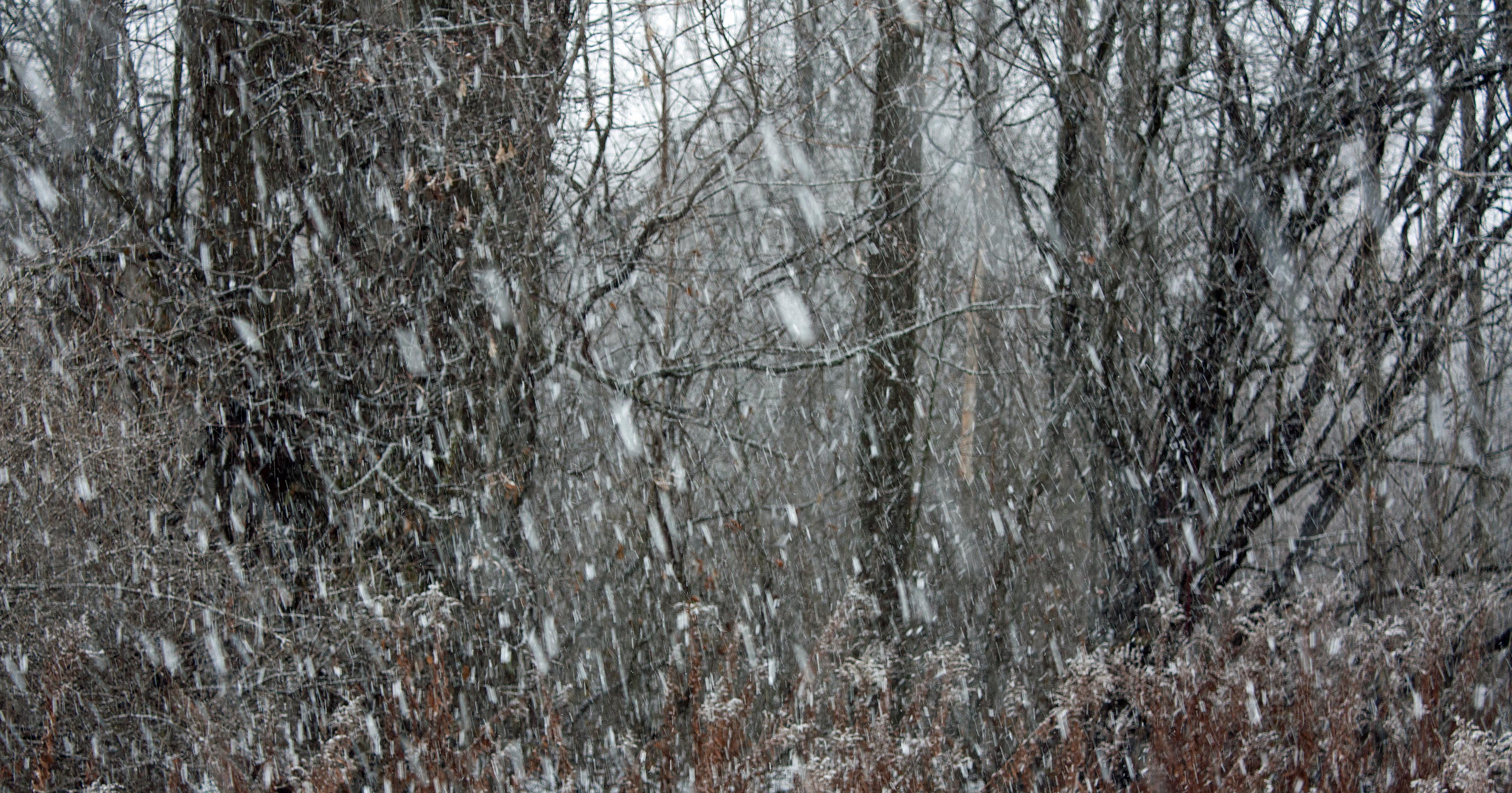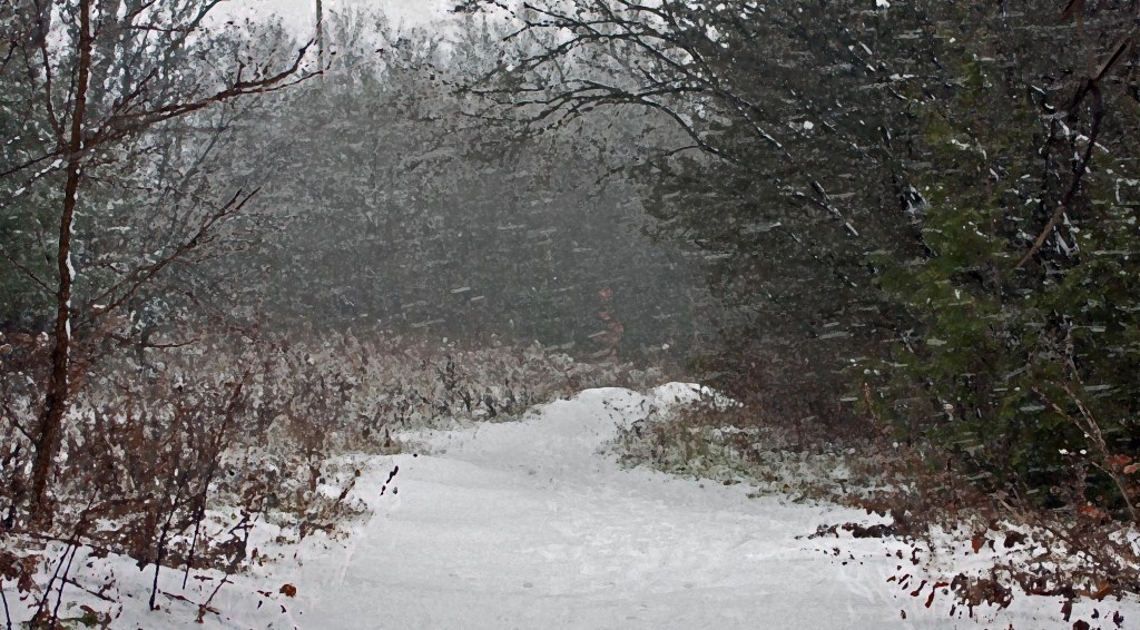 A snowstorm turning into a blizzard in a forest, ON (photo by Nina Munteanu)