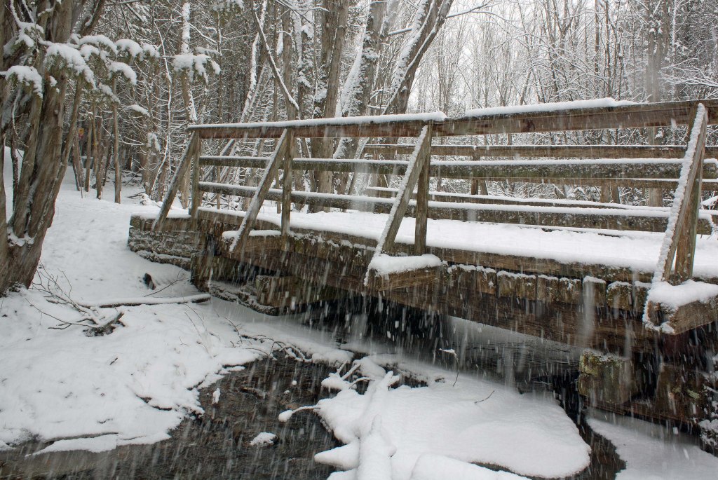 Heavy now falls on a wooden bridge in Trent Nature Sanctuary, ON (photo by Nina Munteanu)