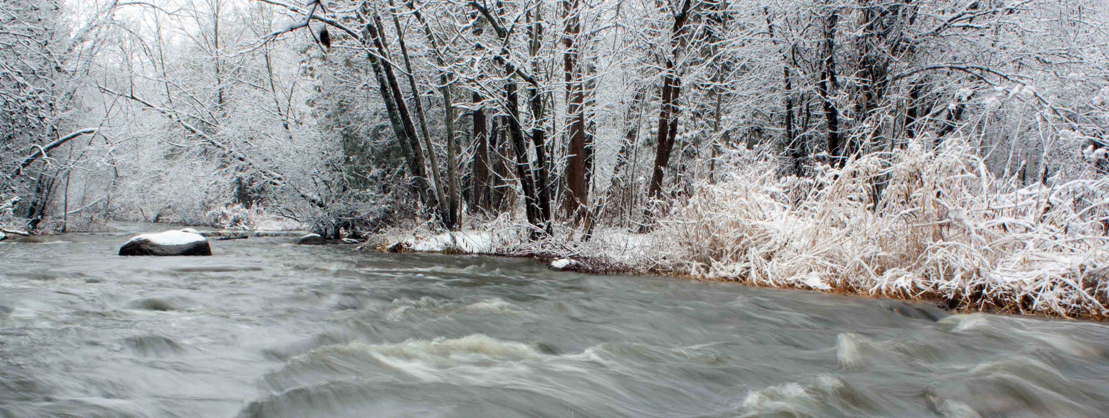 Jackson Creek flows through a mixed cedar forest with freshly fallen snow in early winter, ON (photo by Nina Munteanu)