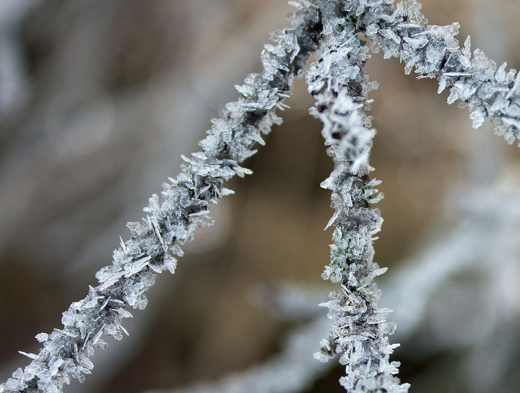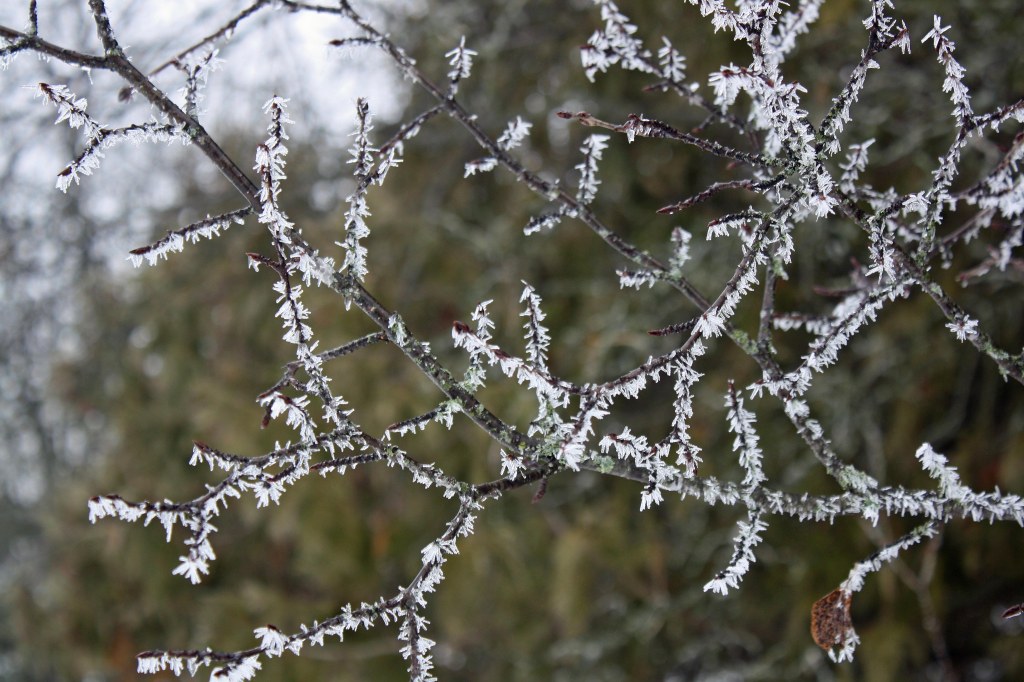 Needles of hoar frost cover the branches of a shrub in early winter, ON (photo by Nina Munteanu)
