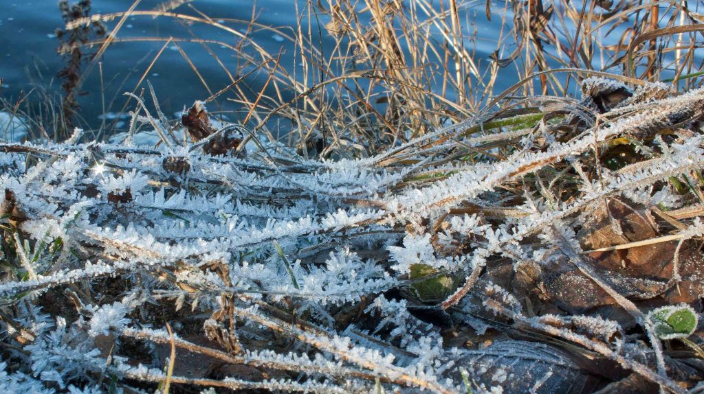 Ground frost forms thick ‘needles’ on vegetation on the ground, ON (photo by Nina Munteanu)