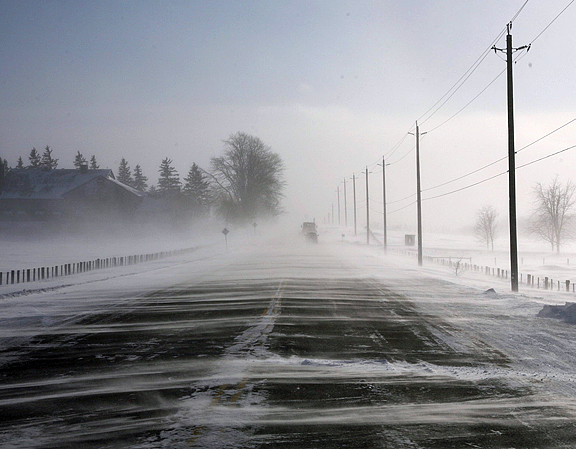 Snow drift across a Candian road in winter (photo by Ian Furst, Wikipedia)