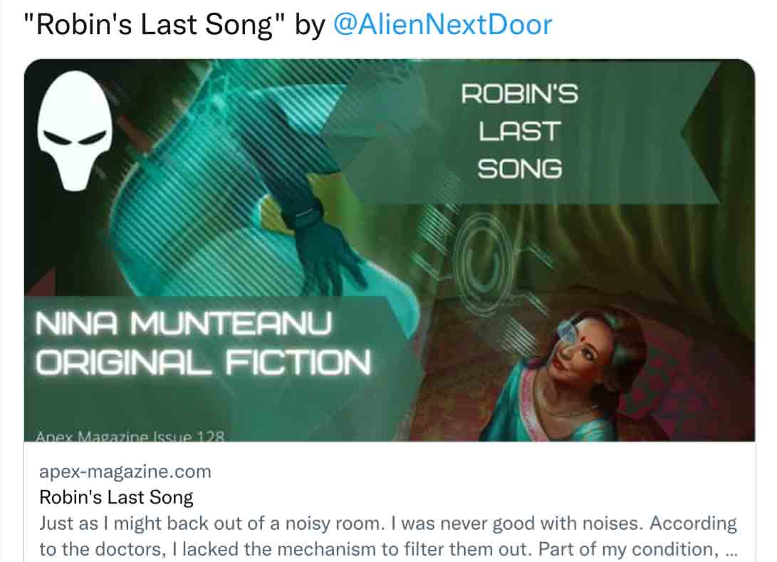 One thought on “Apex Magazine to publish 2021 Anthology with Nina Munteanu’s “Robin’s Last Song””