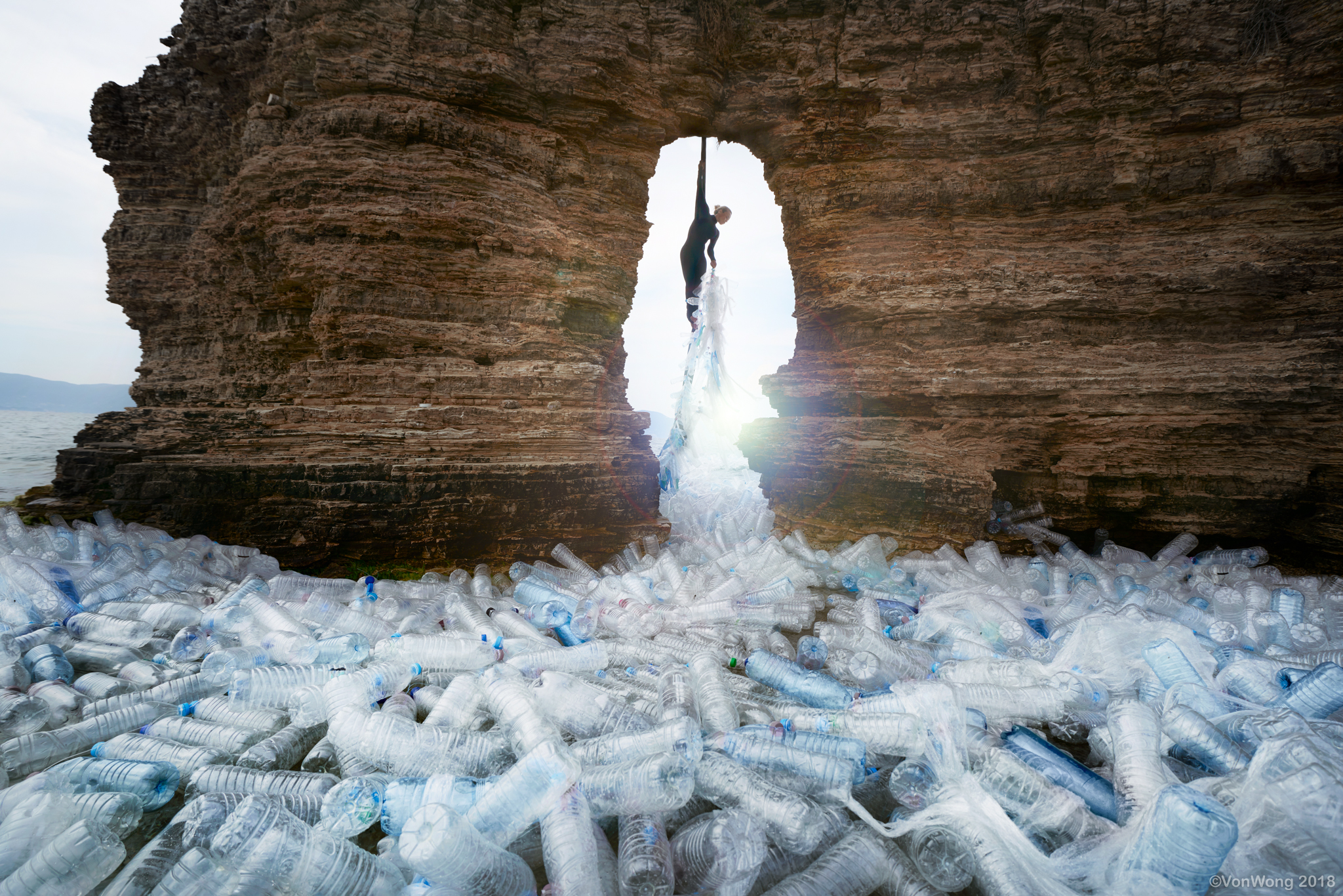 In another work, Benjamin Von Wong collaborated with Greenpeace and aerial performance artist Katerina Soldatou to create “Every 60 Seconds,” which highlights the fact that a truckload of plastic enters the ocean every minute.
