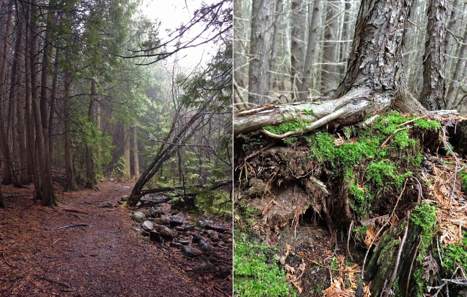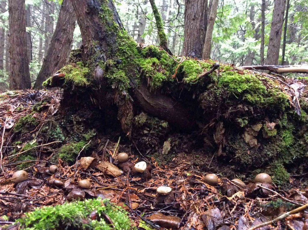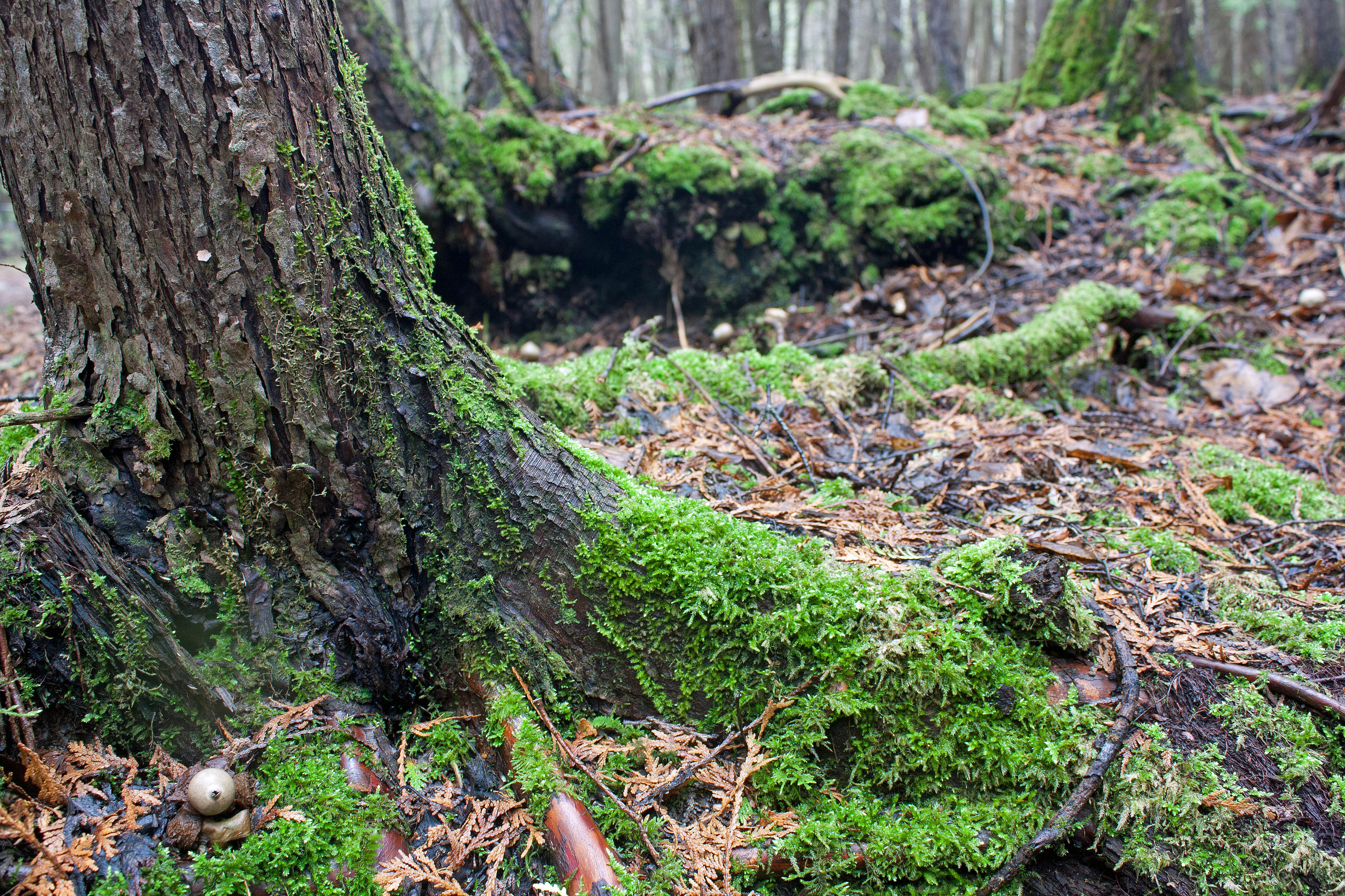 Amid the soft hush of the breeze through the leaves, the tall trees leaned into each other, groaning and clanking like whispering gossips. Moss crept up their widely planted feet. It carpeted the russet duff on the ground with splashes of fluorescent green. Several over two-hundred-year old cedars had fallen and their decaying bodies were feeding a whole new generation of trees. Cedars growing on cedars. I left the path and climbed onto a several metre-wide and twenty-metre long moss-covered cedar corpse. My steps sprang over spongy ground—now a mixture of rich soil, decaying wood, fungus and detritus. I could make out the black fibrous layers of decaying wood beneath a carpet of moss and dead leaves.