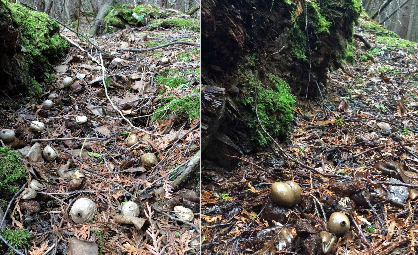 With the rain, the greens and russets grew intense. The moss sparkled. The air grew thick with moisture and a mist veiled the forest in soft gossamer. When I looked down at my puffballs, I noticed that the delicate whitish rice-paper spore sacs had transformed into tan-coloured rubber balls that sprang back like pressurized balloons if poked. I would never have imagined this and found myself grinning in the magic of discovery.
