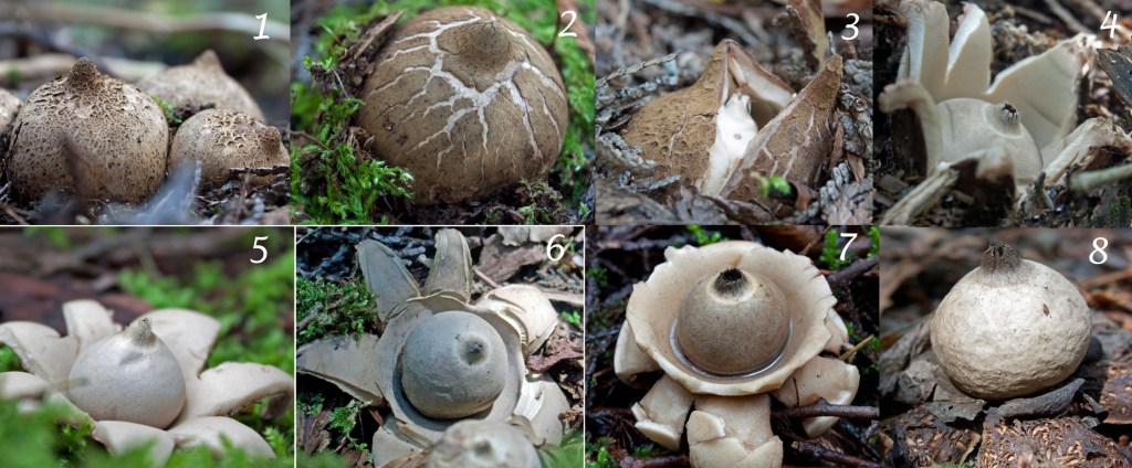 Just as I made to leave this magical cedar swamp forest, I caught sight of what looked like an errant wandering puffball on top of one of the ancient logs. Unlike the others whose spore sacs were nestled in an outer collar, this puffball’s spore sac was perched proudly high, atop a series of ‘legs,’ the rays of the outer peridium. The puffball resembled an octopus standing on its many tentacles. I later identified it as another species of Earthstar, the Beaked Earthstar (Geastrum pectinatum), which likes to live under (and on) conifers.