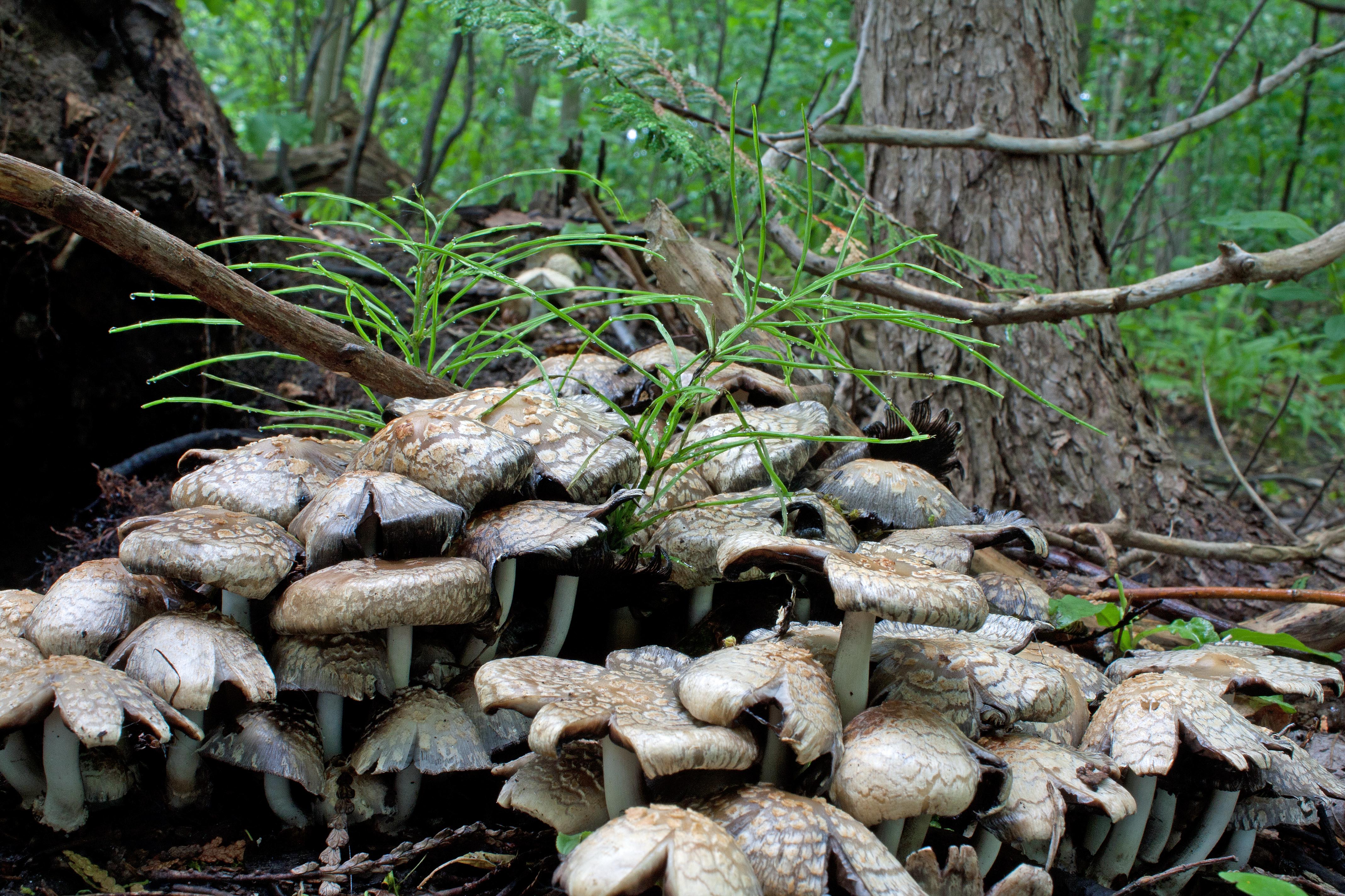 Perhaps it doesn’t matter; suffice to say that the genus Coprinellus, the ink cap, is fast and efficient. The fruiting bodies burst out of the ground or rotting tree following a moist rain, formed great colonies of mushrooms that matured as though they knew when it would be perfect for the dispersion of their spores and just when the big rains came they did what they needed to do—their caps liquified in a process called deliquescence and spread their inky substrate full of spores in the rains—then collapsed back into obscurity. All within three days. Did the Coprinellus fungi escape the black walnut when the storm toppled it? I saw large strips of bark scattered on the ground at the base of the tree and that is where I saw a concentration of Coprinellus (beneath the bark strips on the ground and on the bark of the tree base); bark is one of the tissue types known to harbor Coprinellus. Was the fruiting stage induced by light? The toppled trees certainly opened up the canopy. Many basidiomycetes need certain conditions of light to complete their life cycle; for instance, Coprinellus domesticus requires blue light, at an intensity of 1.5-3 x 104 erg/cm2 sec-1 and 7-9 days of light to produce the mature basidiocarp. Light is known to induce fruiting and asexual sporulation of the dikaryon stage of other endophytic fungi.