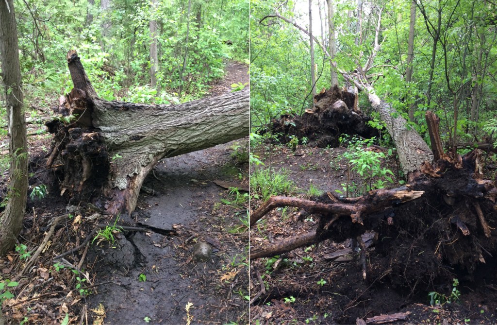 One incident of toppled uprooted trees occurred near my house, involving two black walnut trees and a silver maple. The first to create the domino effect was an old black walnut snag that had toppled over the forest path before knocking over another tree.