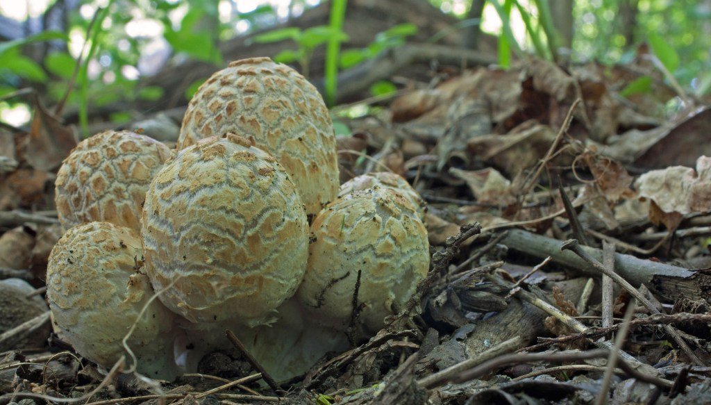 On June 5th, two weeks after the storm, on the base and surrounding ground of the uprooted old black walnut tree, I discovered many clusters of ink caps (which I identified as Coprinellus domesticus, which could also be C. radians). When I first saw the mushrooms, they were just starting and my first thought was, “these are puffballs!” But close inspection revealed that they were just young ink caps heavily veiled.