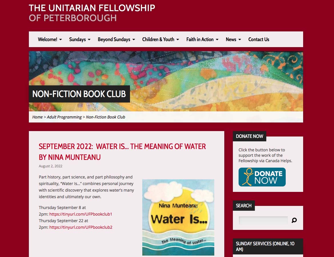 My non-fiction book about water “Water Is…” will be discussed in the non-fiction book club of the Unitarian Fellowship of Peterborough this month: September 8 and 22.