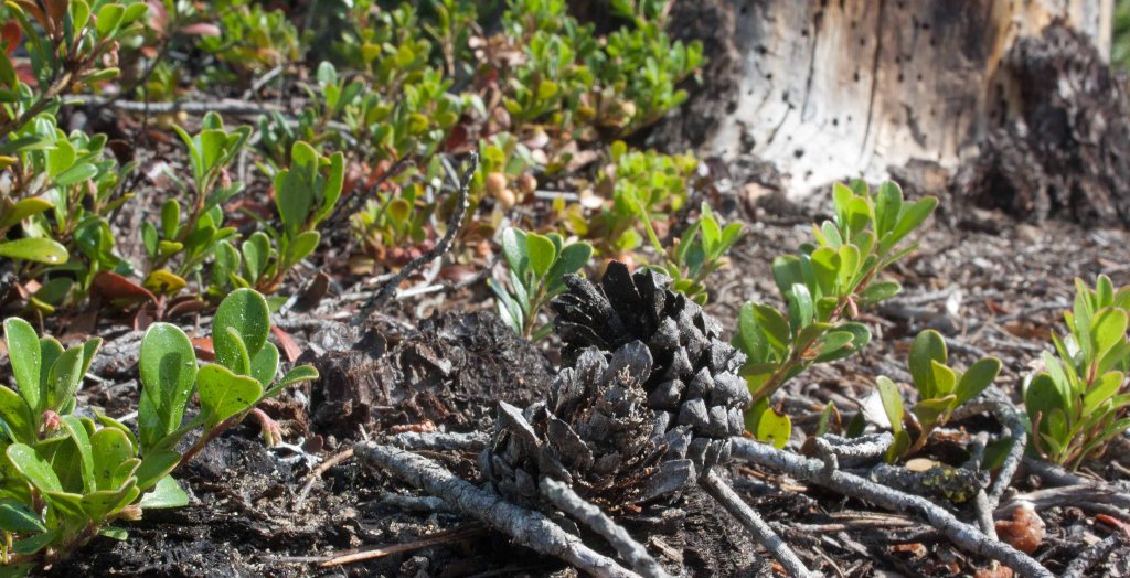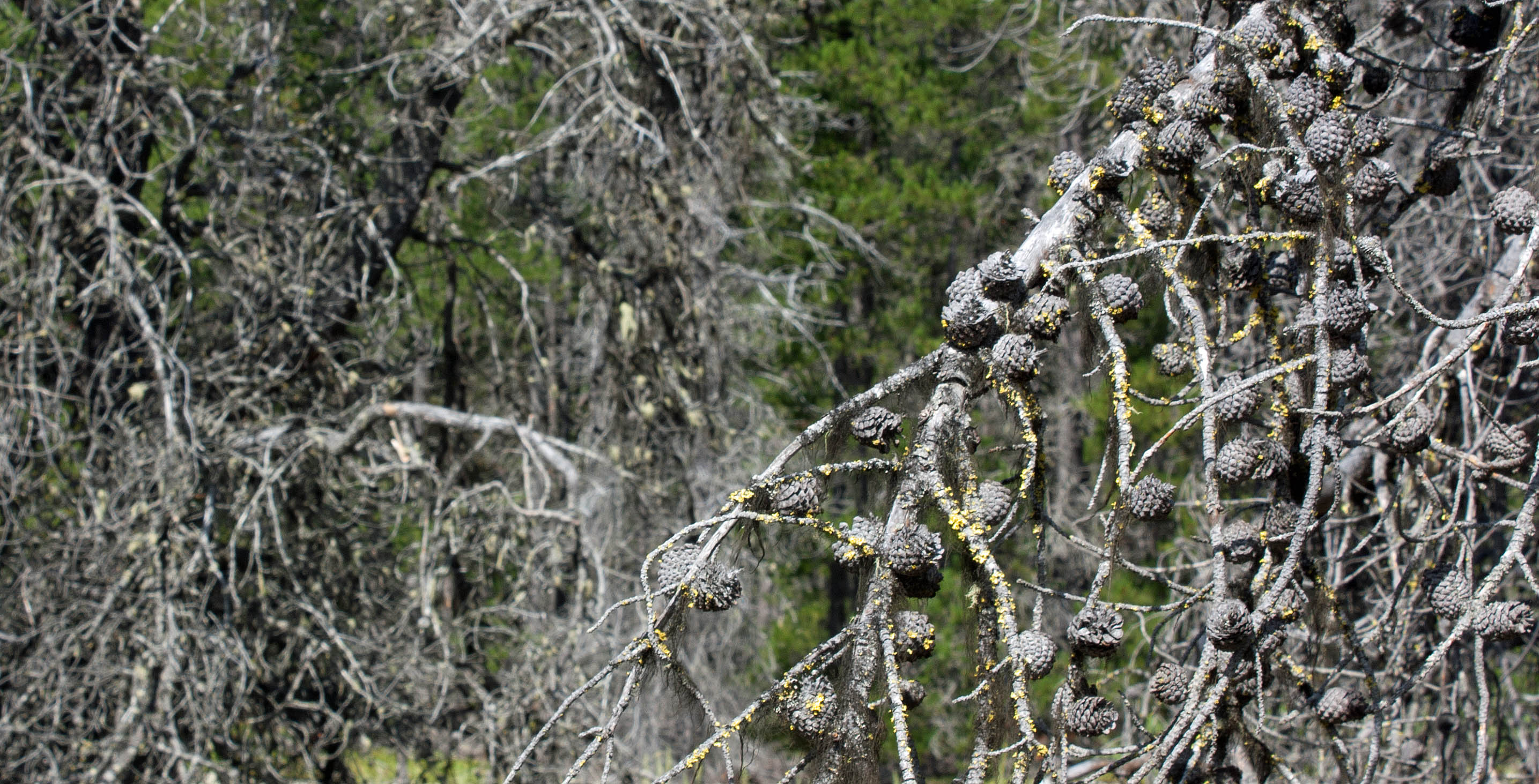 Despite the beneficial role of wildfire in the regenerating natural succession of this ecosystem and the life cycle of lodgepole pine, this natural disturbance event has been eliminated by park managers for safety reasons; as a result, the pines are now more prone to insect and disease events. I saw a number of dead pines covered in charred cones that had burned some time ago. Poisonous fruticose wolf lichen (Letharia vulpina) covered man branches and cones with clouds of bright yellow-green. This lichen is somewhat toxic to mammals due to its yellow pigment vulpinic acid, and has been used historically as a poison for wolves and foxes. Wispy hair lichens, dark brown Bryoria known as Horse-hair lichen, hung off the dead branches. Grey-green Usnea, also called Old man’s beard, formed long tassels anchored on the bark and twigs of the old pines.