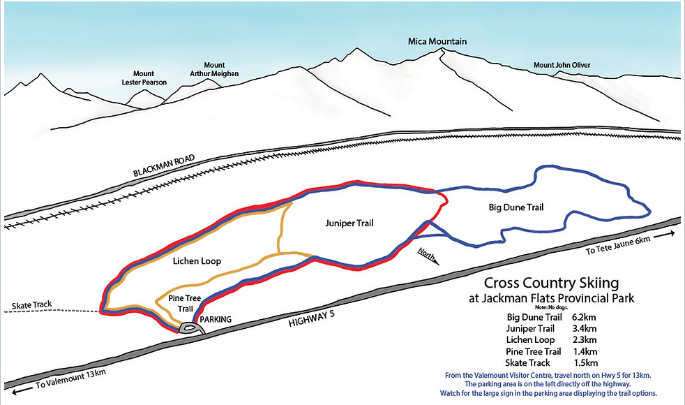 Rivers from the Cariboo Mountain Range carried mud, sand and gravel into the glacial lake of the Trench. When the climate warmed and the lake dried up, wind picked up what was exposed in the lake bed. It left the stones, blew the very light material down the valley in clouds of dust, and dropped sand-dune deposits in the flats. That’s how Jackman Flats was formed.