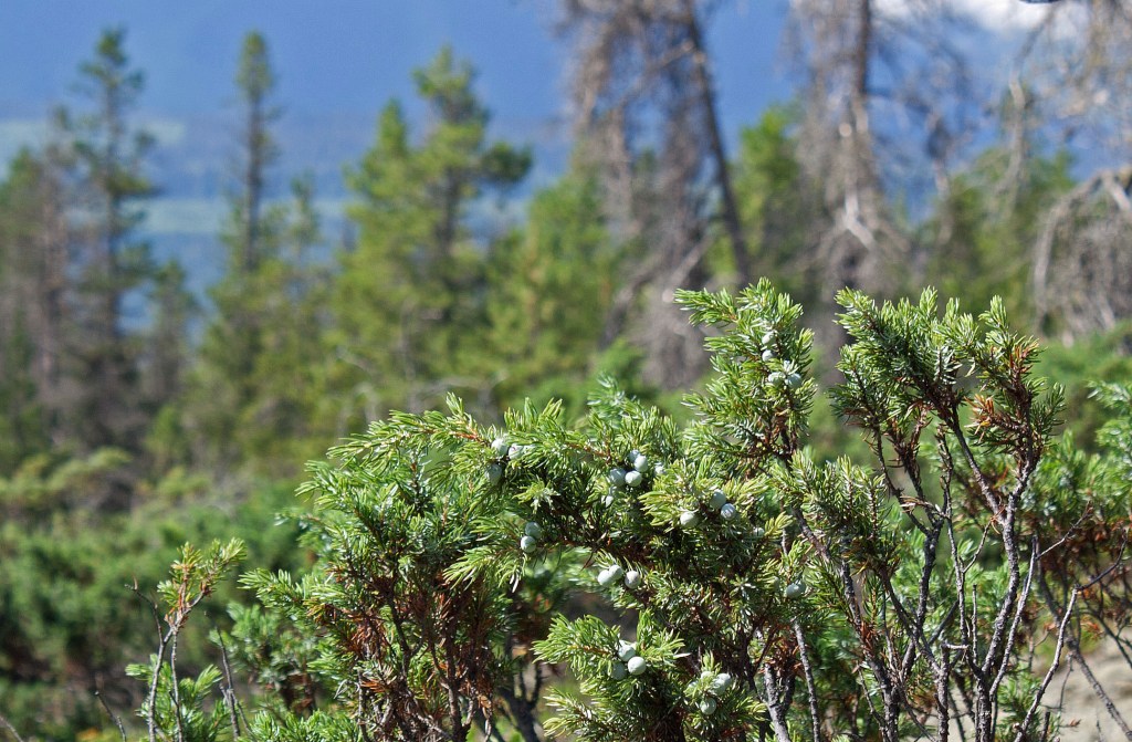 We started our walk on the Pine Tree Trail, heading toward the Juniper Trail. The area supported healthy lodgepole pines (Pinus contorta) growing amid low junipers, kinnikinnick, lichen and grasses. The lodgepole pine is one of the most widely distributed tree species in western North America and reproduces from seeds housed in their cones. The cones can be either closed (seritonous) or open (non-seritonous) and can shift from one to the other depending on the environment. In areas prone to fires the lodgepole pine produces serotinous cones (protected by a waxy coating) that require the heat of fire to release their seeds. Trees may produce up to 9,000 cones in a single growing season. I’m told that it is common for multiple years’ worth of cones to build up on a tree. The average serotinous cone can remain on a tree for at least 15 years, some lasting for decades, before a fire blazes through to open them. The lodgepole pine gets its name from its use in teepees and lodges; it remains highly desirable timber for rail fences, barn structures and log cabins. The lodgepole pine commonly lives to 150 years; some live up to 400 years.