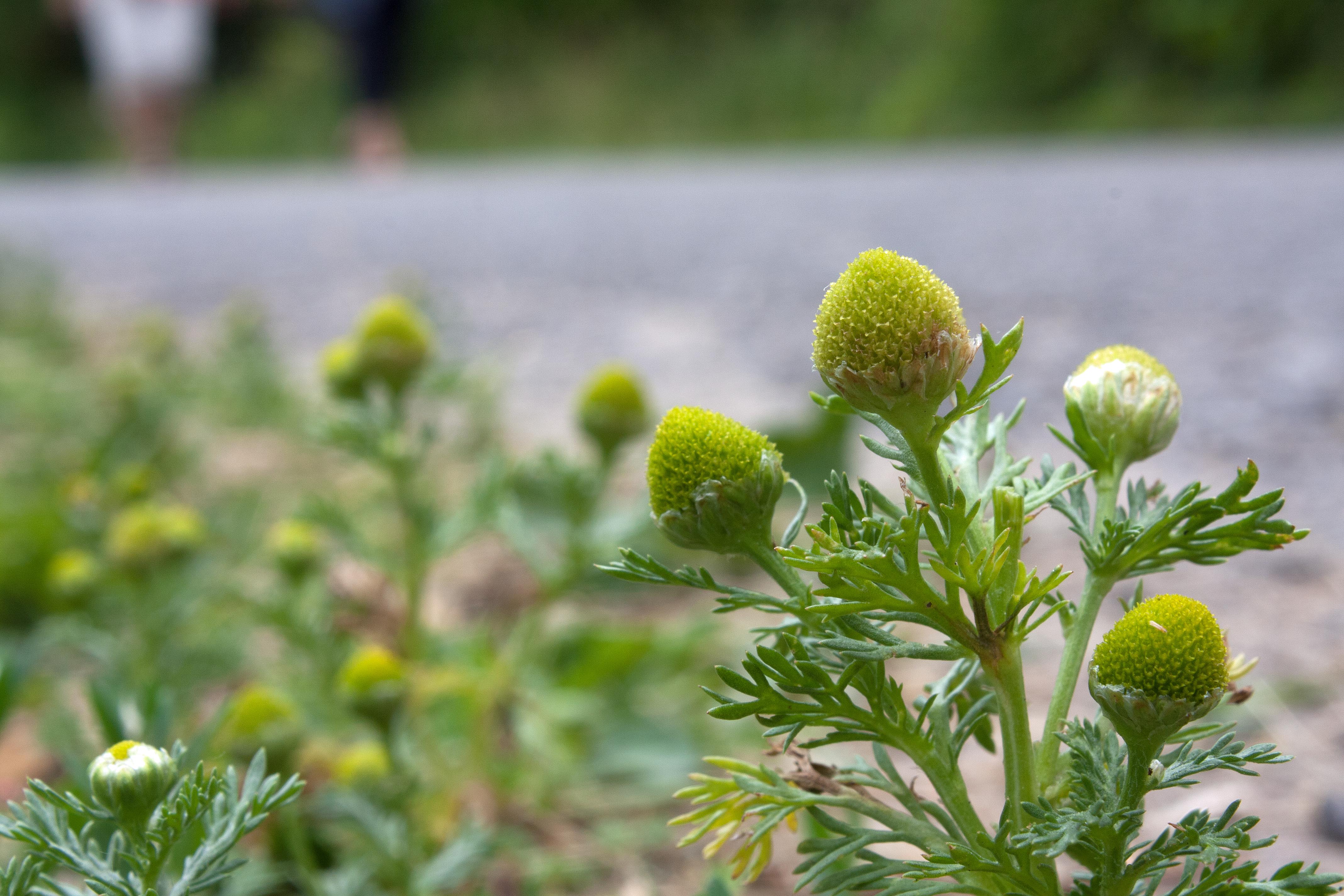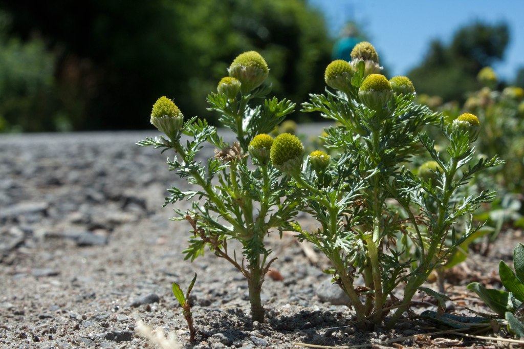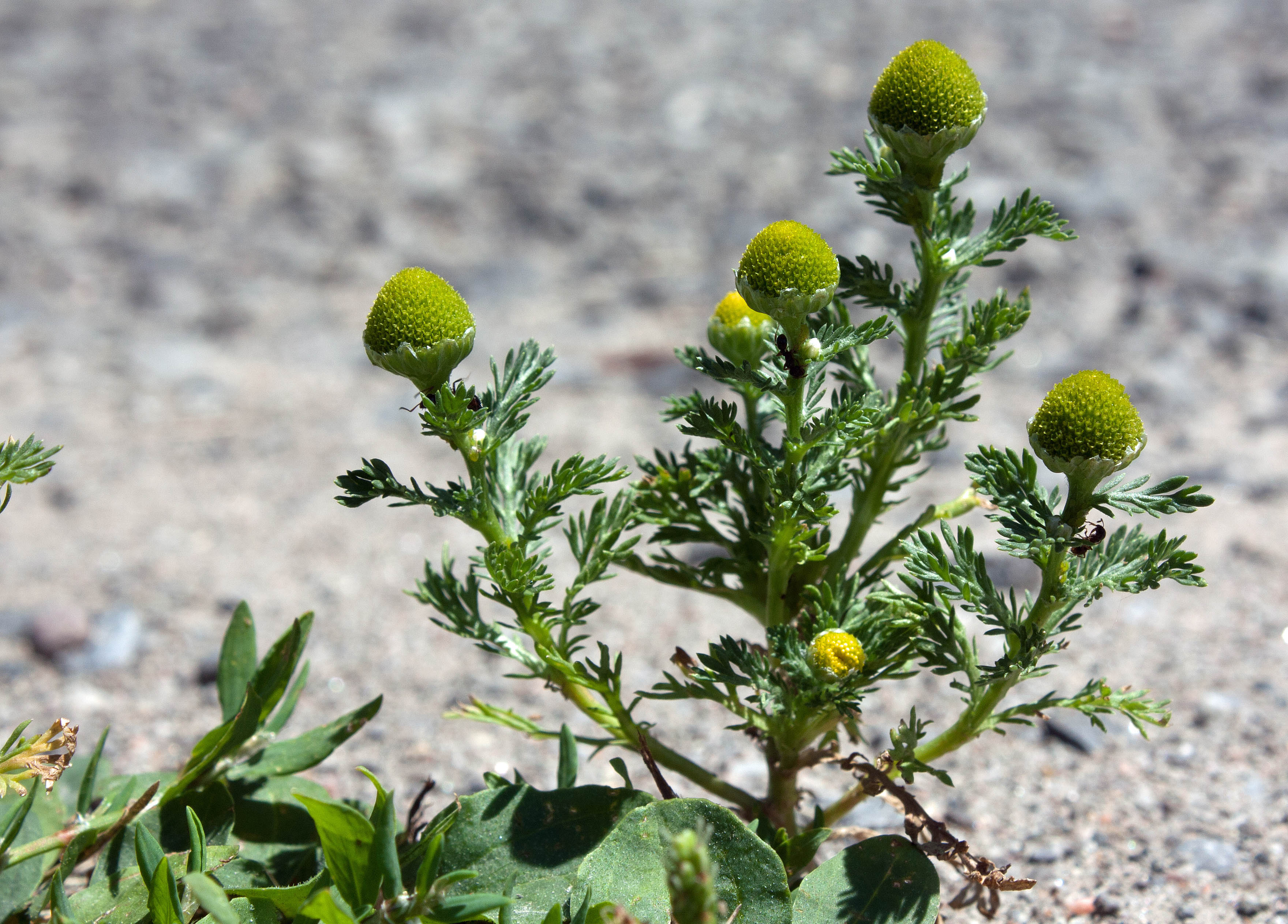 Pineapple weed is easy to identify: frilly leaves, petal-less yellow-green cone-shaped flowers and diminutive size; and compacted soil as habitat (e.g. highly trafficked areas, such as driveways, parking lots, paths and trails). This tough plant seems to not only survive regular trampling and compact soils; it seems to thrive in them. Botanist John Hutchinson wrote, “the more it is trodden on the better it seems to thrive.”