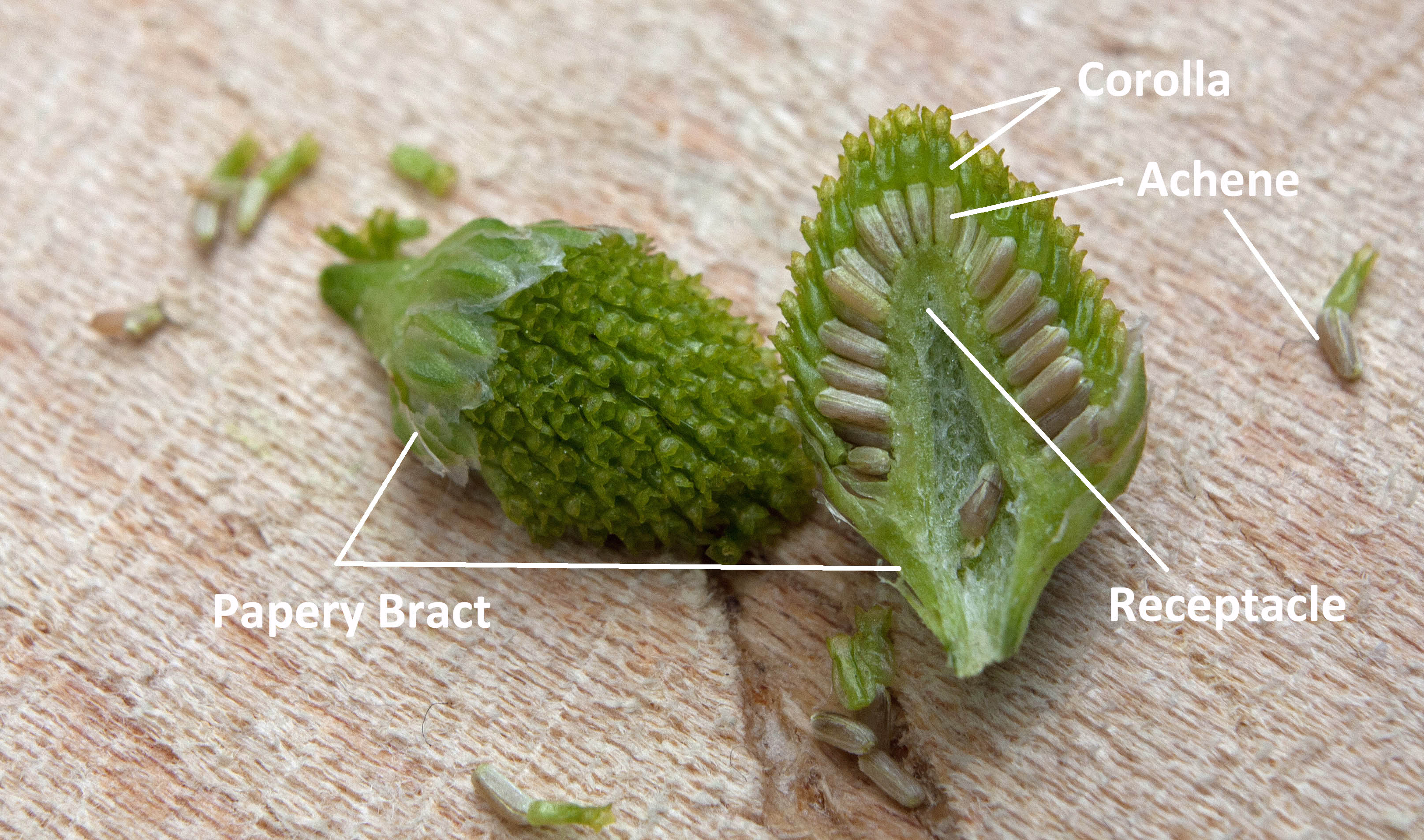 Pineapple weed (or wild chamomile) is an annual herb that belongs to the family Asteraceae and is also called a ‘rayless chamomile’ because it only has disk florets–no ray florets, like the German chamomile. The cone-shaped flowerhead contains densely packed yellowish-green corollas of disk florets. Each floret is made up of a corolla of fused petals that sit on a fleshy cone-shaped fleshy receptacle. The seeds, attached to the receptacle, are enclosed in an oblong light brown fruit or achene. The seeds are gelatinous when wet and stick to feet or fur of animals, helping them disperse. Seeds also spread by water.