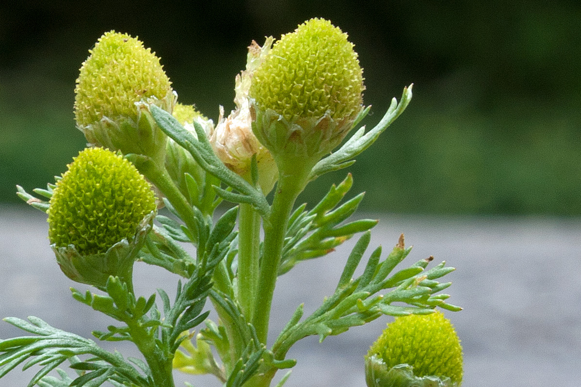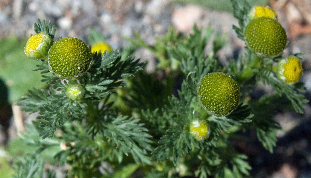 When I was a little girl growing up in Granby, in the Eastern Townships of Québec, I helped my German mother collect some ground weed that grew on the edges of roads and paths. It seemed to prefer the hard packed pavement-like soils of road edges where nothing else, except the odd plantain, grew. She called it Chamomile. My mother wasn’t in Germany anymore, but this North American ‘chamomile’ native would do just fine for her. She dried the sprigs and used the flowerheads to make a wonderful subtle floral tea that tasted aromatically sweet with the mild aroma of chamomile and a strong hint of pineapple taste. She often gave it to me when I had a cold or upset stomach (from eating too many wild apples or rhubarb from the garden). I found it a soothing, calming drink and to this day associate it with my kind-hearted mother.