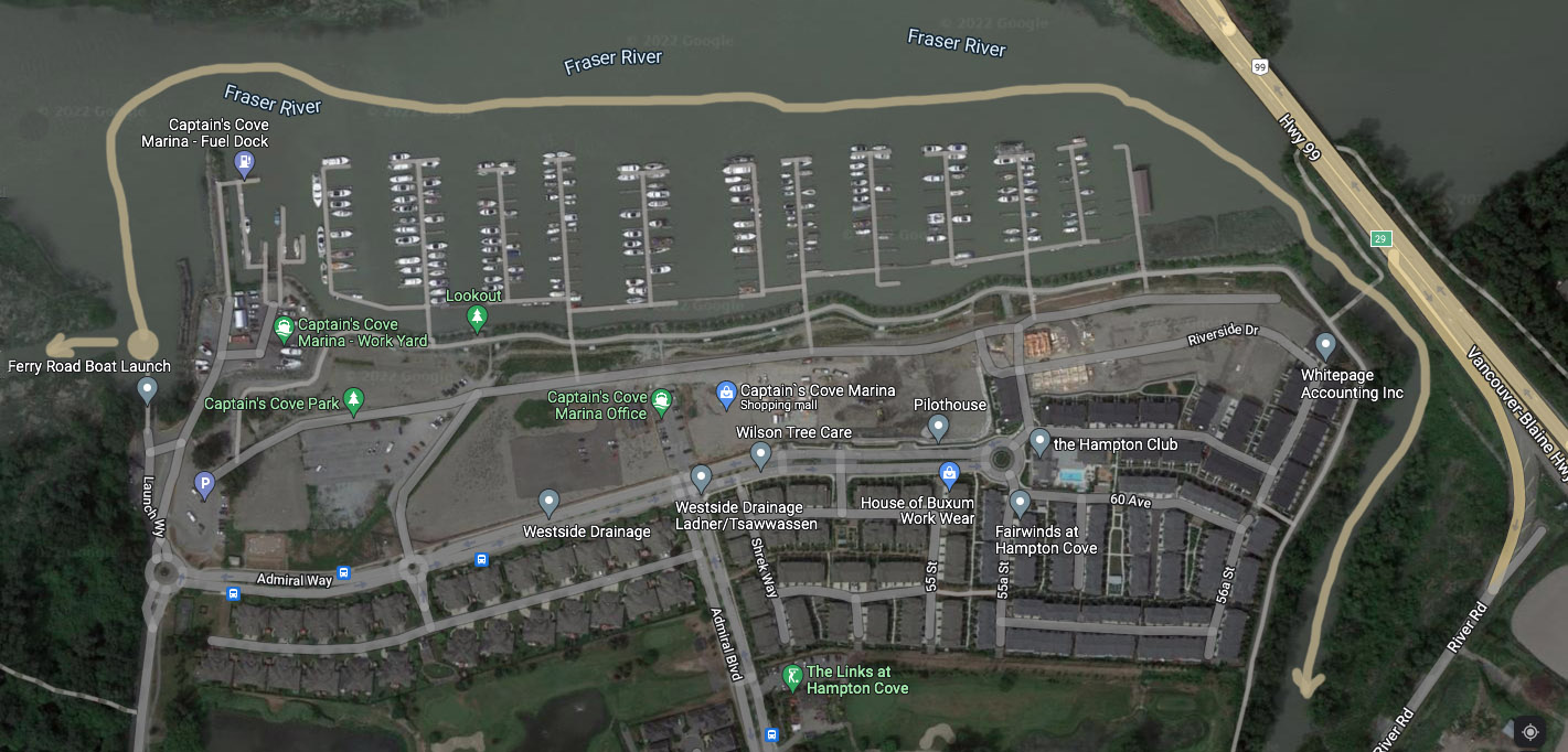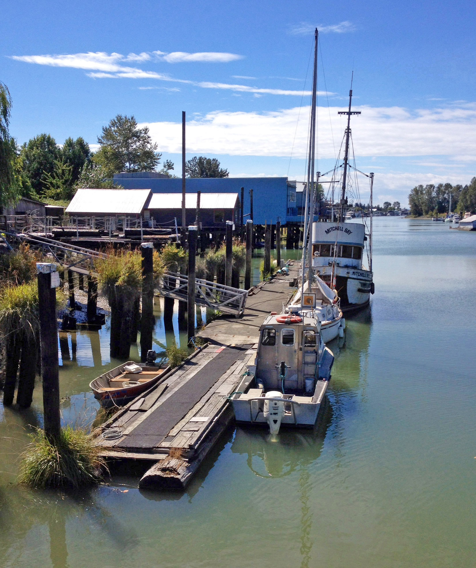 A perimeter dyke trail connects Ladner Lagoon with Ladner Harbour Park, known by locals as “Bunny Park.” I often visited this park with my young son to watch the rabbits and walk the local forest trails, such as Swenson Walk, often frequented by bald eagles (looking for breakfast, no doubt). The site is a historic feral rabbit sanctuary and in 2012 over 500 wild rabbits that had crowded the Delta Municipal Hall (the result of generations of abandoned pets) were relocated to Ladner Harbour Park. To get there, we crossed Harbourview Bridge from River Road onto Mcneelys Way with views of the harbour at Ladner Boat Basin.