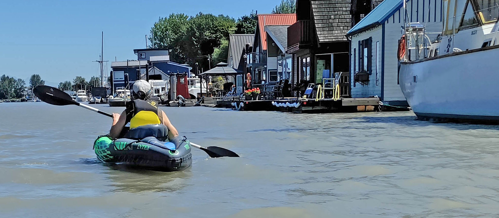 The kayak rental company brought the kits in two large bags to our doorstep in the morning. We then launched at the boat dock near Sharkey’s Seafood Bar & Grill in downtown Ladner. The kayaks were Skookum inflatables with easy instructions to set up and inflate. Within twenty minutes we were ready to go.