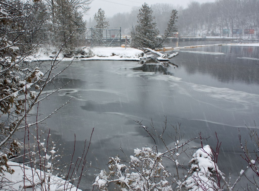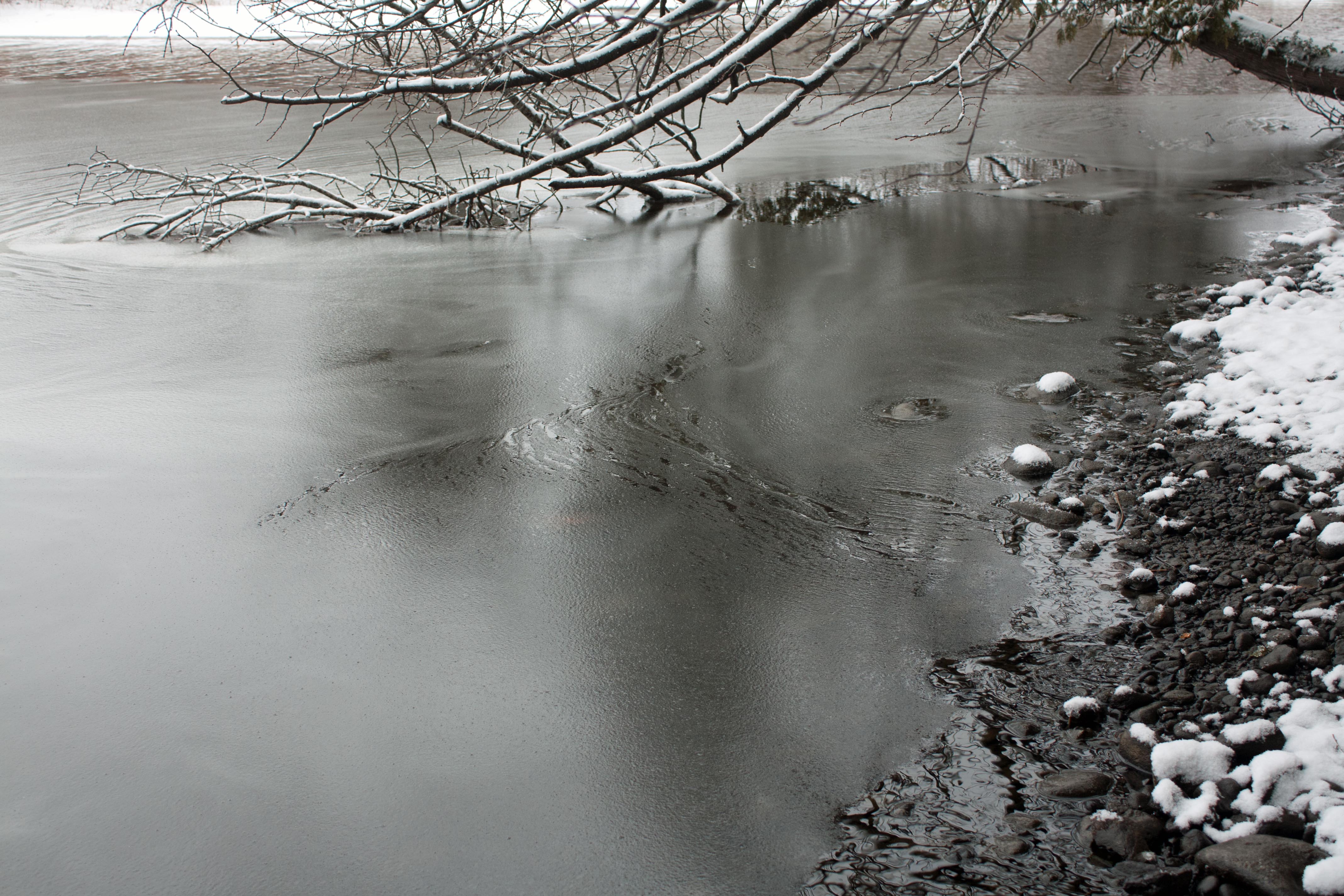 I put my precious camera in its own hat to protect it between camera shoots and ventured down to the river, where I saw the ice forming on the river from the snow that fell on it. The ice made long, meandering films called grease ice because the film looks like a layer of grease on the surface. It will thicken and become stiff, but to start, it is just like a greasy film on the water’s surface, moving with the waves…