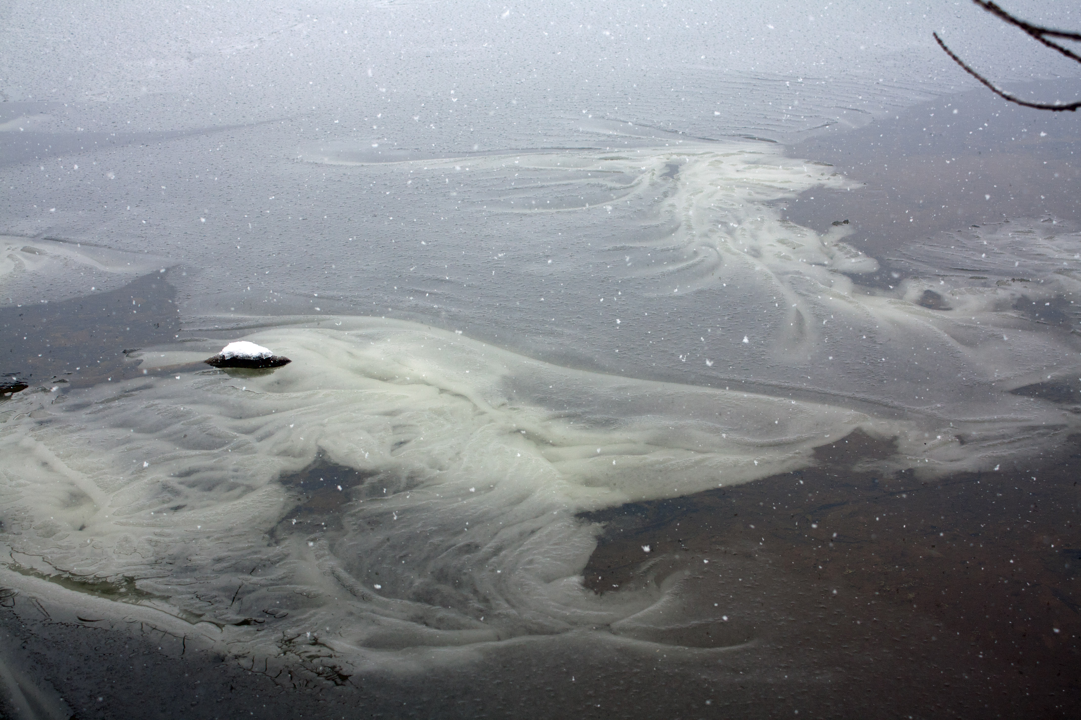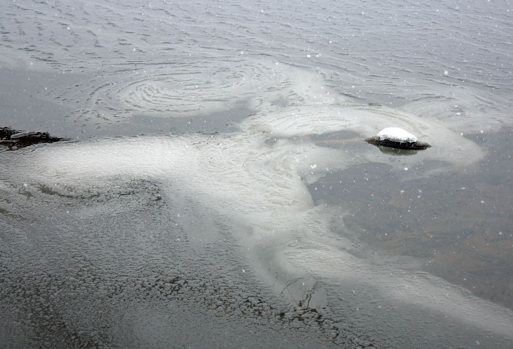 Sometimes, depending on what else is in the water, the grease ice will turn a kind of brown-yellow and form what to me looks like curtains of pale yellow drapery floating on and just below the surface of the water.
