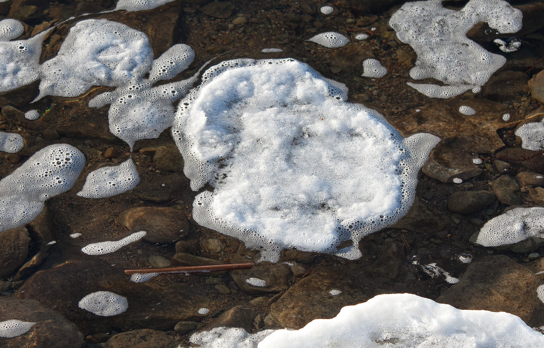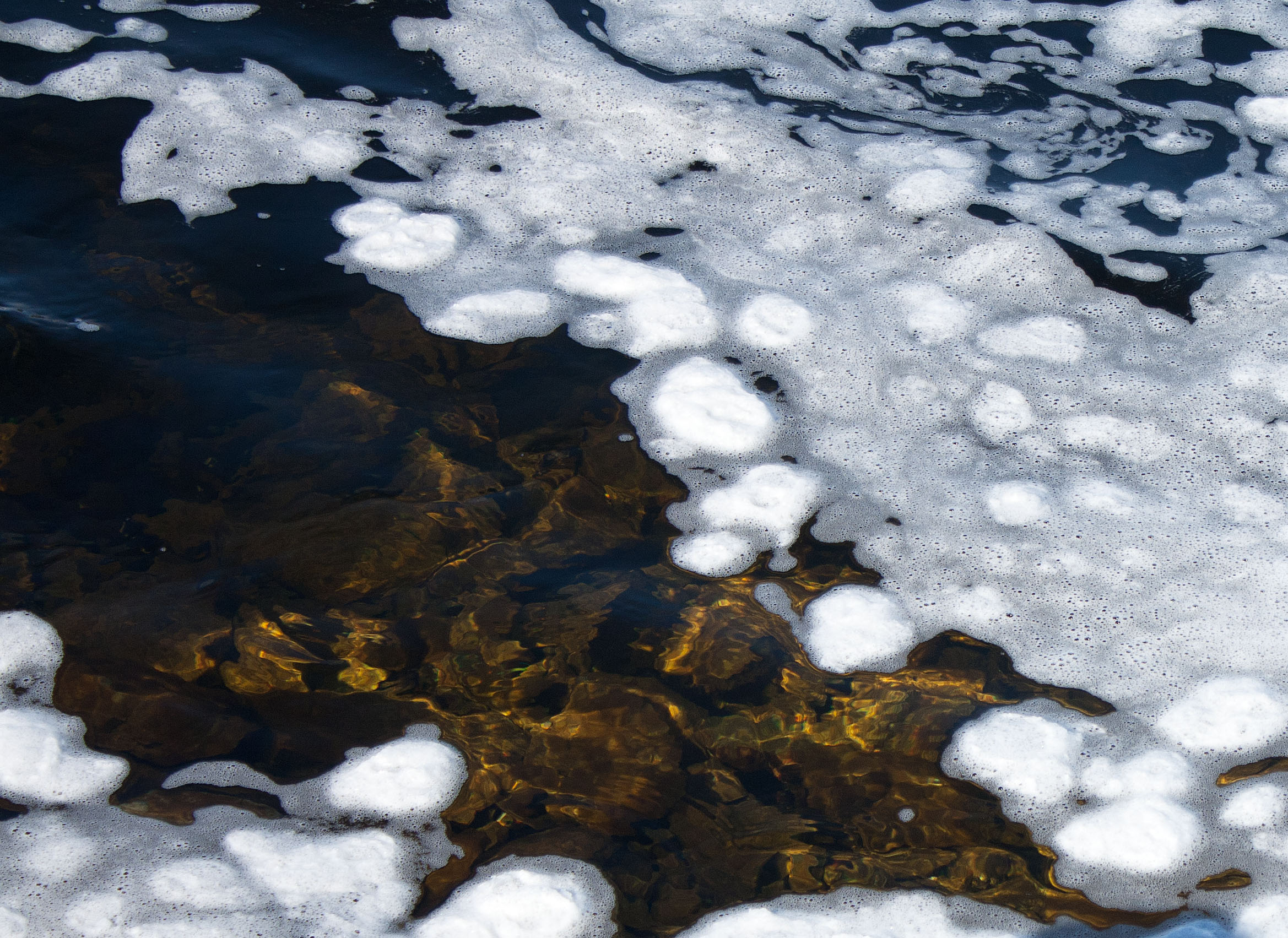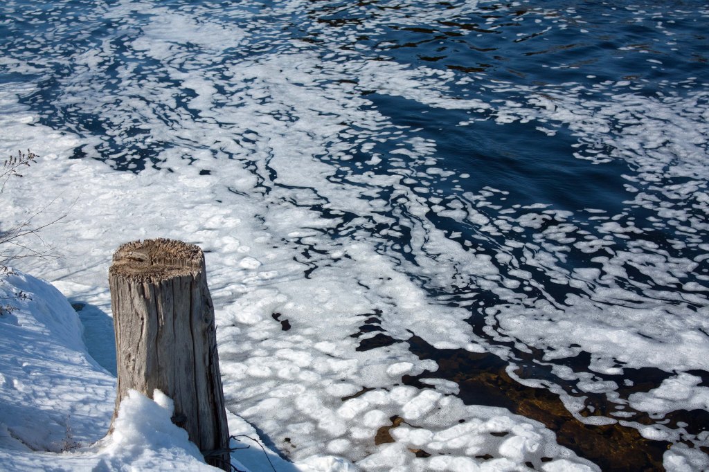Small, fist-sized, ice pancakes were creating themselves from ice-foam that was coming down from the dam. I watched the foam and pancakes drift down the river and get caught on shore or on the edge of an already existing ice raft. The pancakes eventually stuck to each other and the shore, sizzling like real pancakes on a griddle. I was mesmerized by the frothing and sizzling.