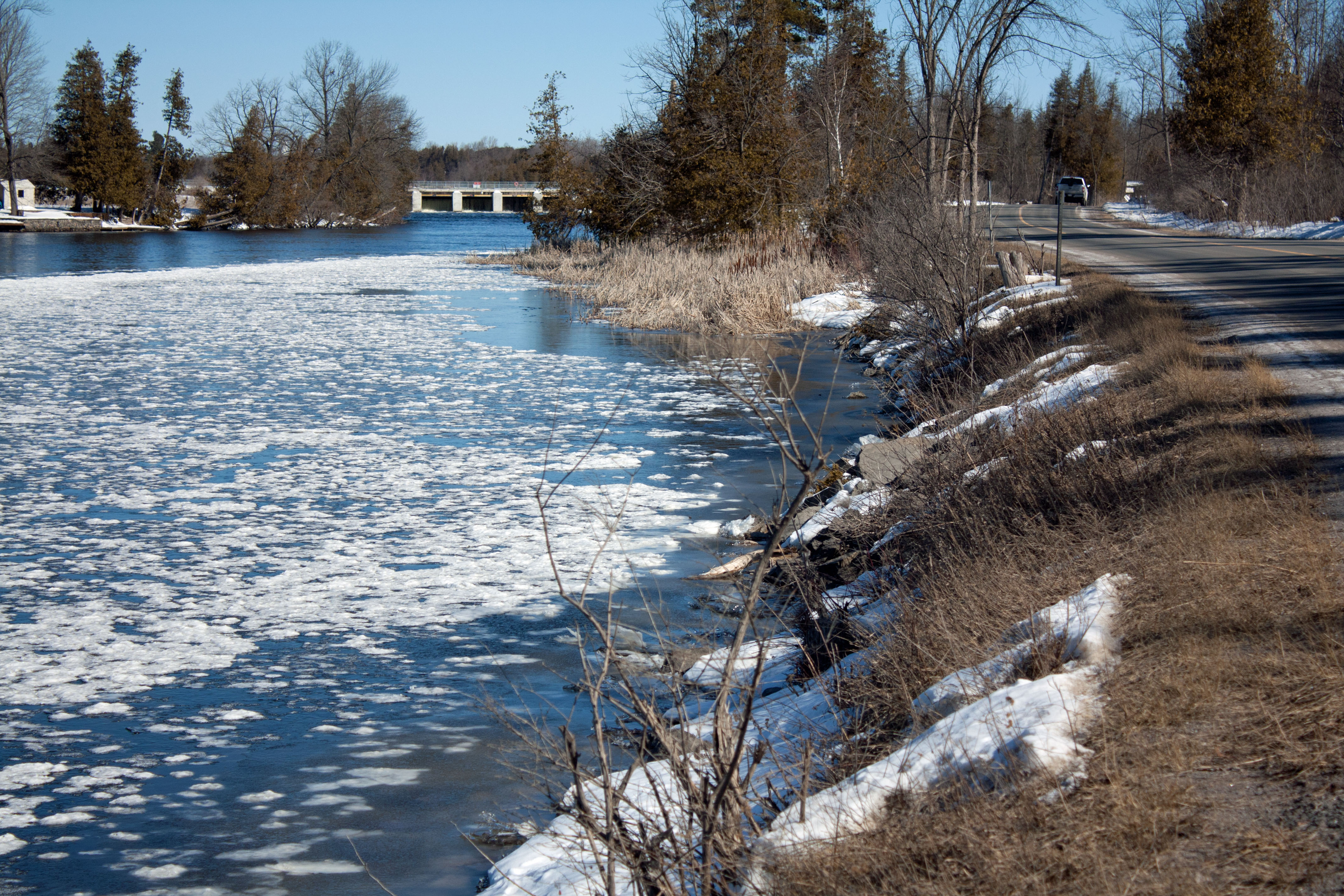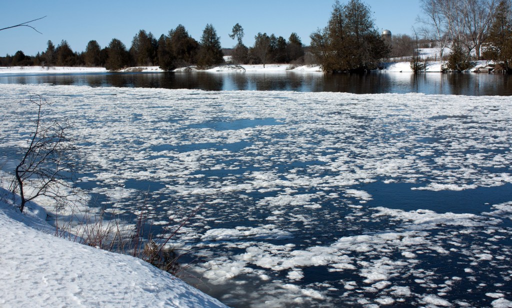 Lately, I’ve been spending part of each day along the Otonabee River, checking the ice. How it forms, thaws, and reforms. All its different forms: Grease ice that looks like floating drapery or a film of grease on the surface of the water; Shuga, small floating snowballs that form after a major snow; Frazil Ice, that forms a layer of aggregated crystals on the water surface as it super-freezes; and, of course, Pancake Ice, which looks like white pancakes of varying sizes that form in more turbulent waters, such as below every dam on the Otonabee River (of which there are several along its length.)