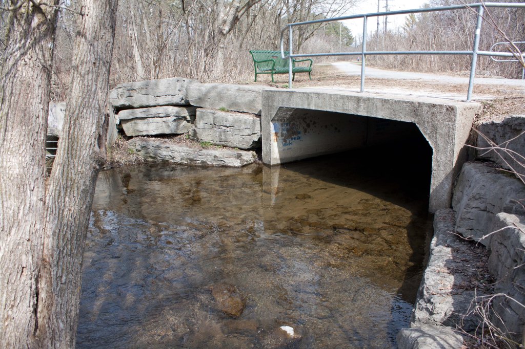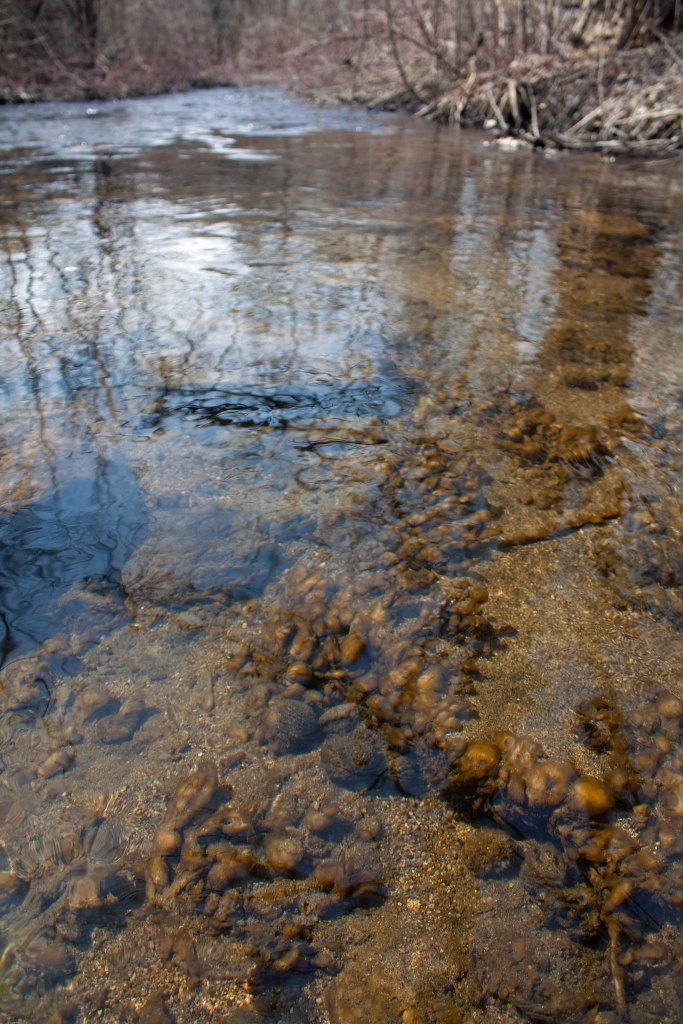 When I put a blob under the microscope, I had to laugh; of course, they were all diatoms! I recognized several genera, the usual suspects that form gelatinous tubes or stalks in small freshwater streams: Cymbella, Gomphonema, Fragilaria, Synedra and Achnanthes. The slippery nature of the colony comes from the gelatinous material the diatoms grow in (tubes) or sit on (stalks) that allow them to attach to a surface. Diatoms can be found in streams all year round and tend to fair better than other algae in cold water. Being rapid growers these diatoms had responded to the recent warm weather and the nutrient pulse from spring thaw. The light, both duration and intensity, had been steadily increasing in the last few weeks. This was enough to spark a bloom. The location, just off the Rotary Trail, was downstream of a large sub-division of fairly new houses and runoff from the streets enters Thompson Creek. Nutrients released in the spring could arise from a number of sources: fertilized lawns and gardens, detergent runoff from car washing, street debris, just to name a few (see my articles on urban runoff).
