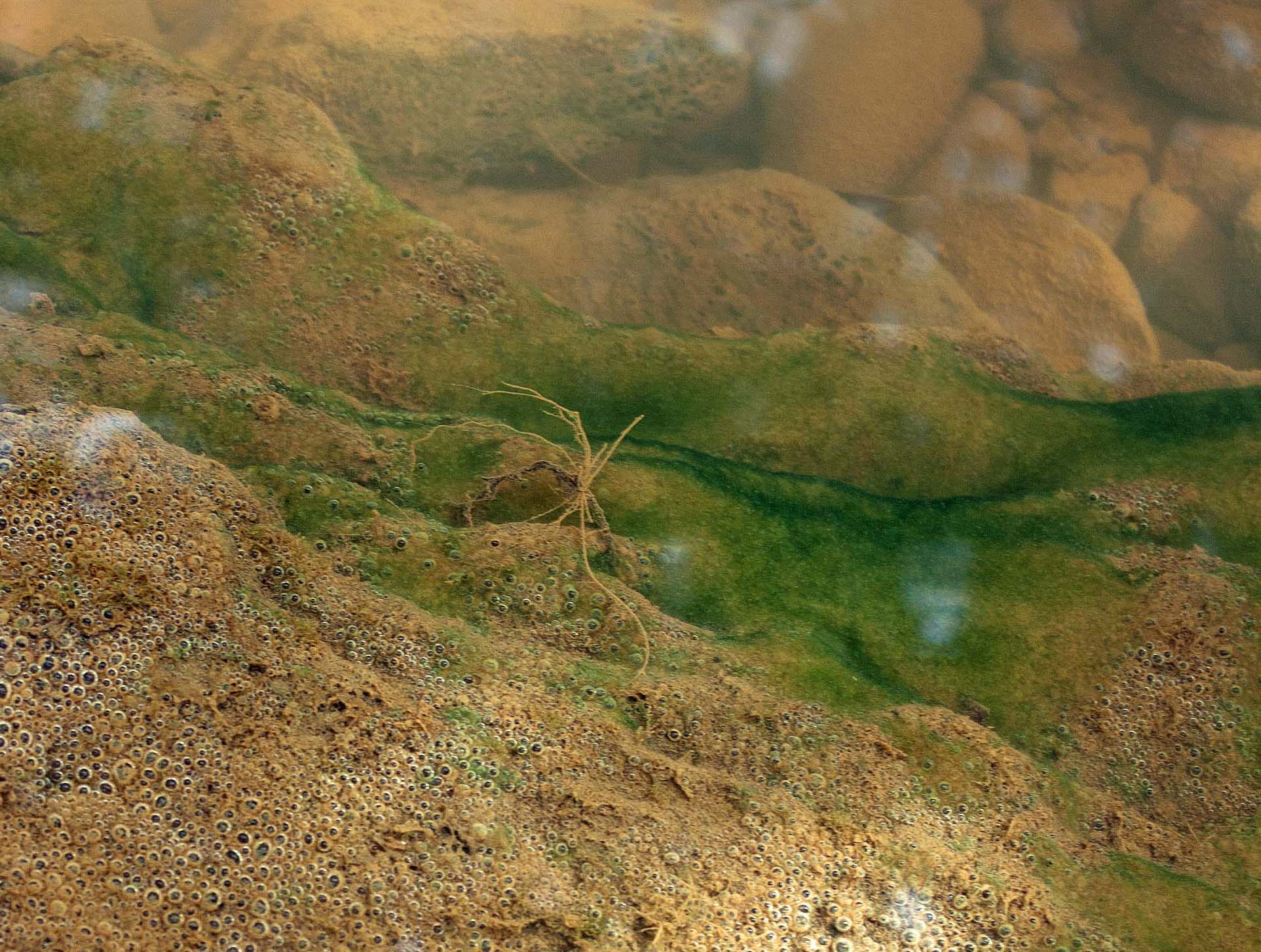 My usual walk along the creek took me to a bridge where I discovered extensive green-brown growths on the rocks and sand. They formed clumps of golden ‘bulbs’ of colonial periphyton (attached algae) that swayed in the current like grass in the wind. They were effusive, I thought. What could be growing here with such enthusiasm so early in spring?