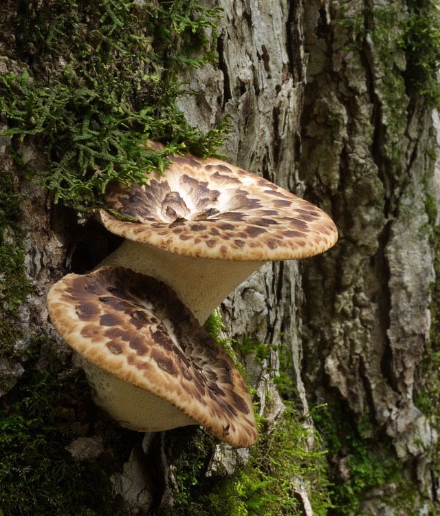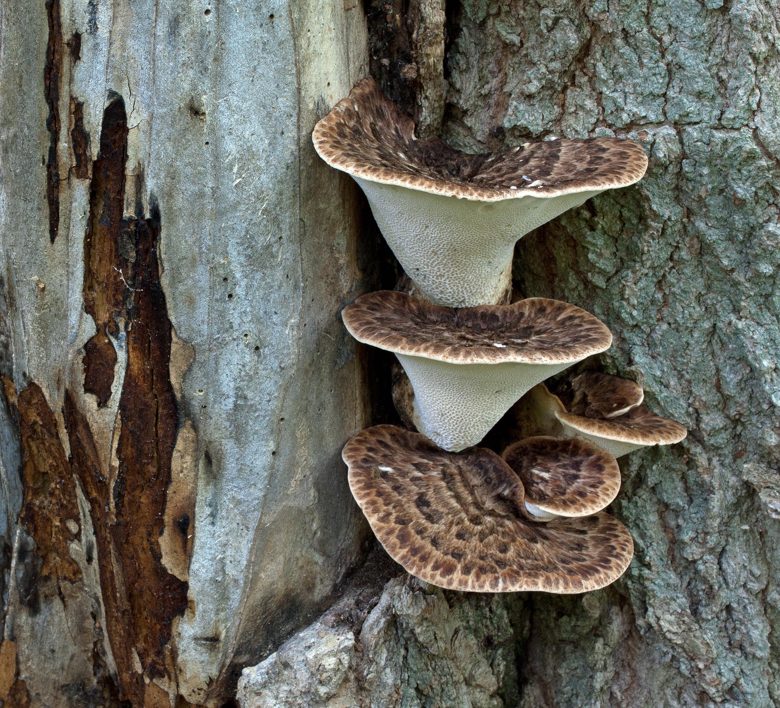 I could understand the other two names for this shelf fungus, given its feathery pattern of tan and brown resembling the back of a female pheasant or the wing of a hawk. I’d missed the early stage of this mushroom, which resembles bottle stoppers or corks, stubby little knobs that develop into pale beige semicircular caps covered with brown, feathery scales, radially arranged. When I gave it a sniff, the aroma was a delightfully tasty smell that resembled a mixture of cucumber with sweet watermelon. It was fresh and sweet with a lingering pleasant perfume. Indeed, Tim Taranto of Little Village tells us that “The best way to identify a Dryad’s Saddle … is by its scent. They have a distinctly un-mushroom like odour, and smell more like a watermelon rind or a freshly sliced cucumber than mushrooms.”