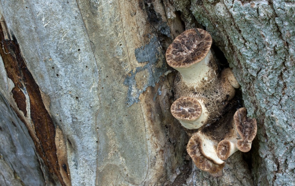 Young ‘buttons’ of edible Dryad’s Saddle mushroom growing on a Manitoba Maple (photo by Nina Munteanu)