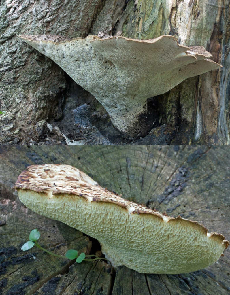 Yesterday, on my walk along a less-used path through the riparian forest of the Otonabee River, I spotted a large bract fungus growing at the base of a large Manitoba Maple or Box Elder (Acer negundo) tree and its dead nearby barkless stump. The fungus at the tree base was growing right above the half decomposed carcass of the previous fungus from the year before whose blackened remains still covering the ground. The white-rot fungus was larger than my spread out hand, spreading out like a fan in a convex semi-circle, with pale tan to dark brown scales above and cream-coloured spongy pores on its underside. The edges of the larger fruiting body were already splitting.