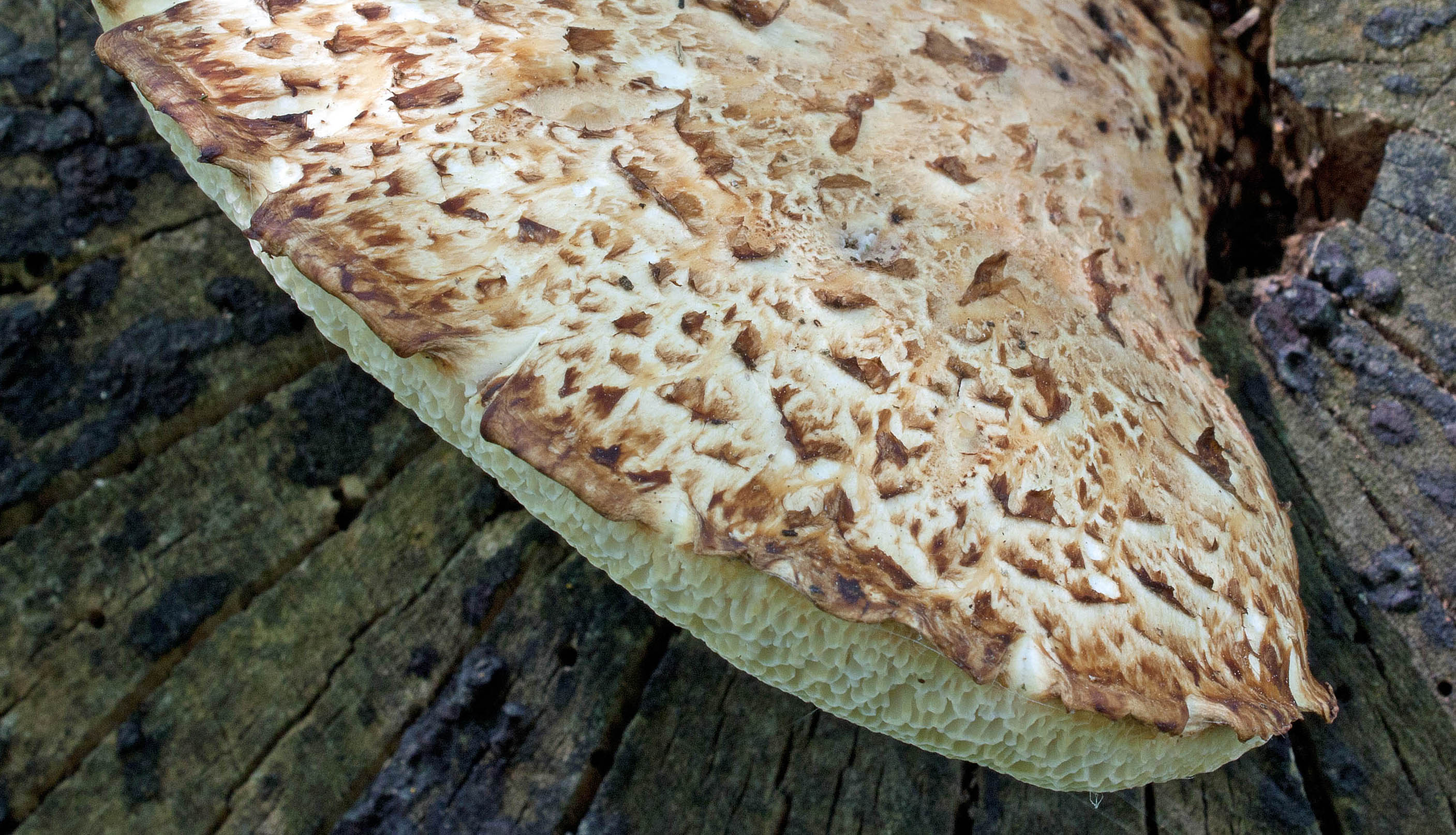 Dryad’s Saddle, showing the underside pores of this polypore mushroom, ON (photo by Nina Munteanu)