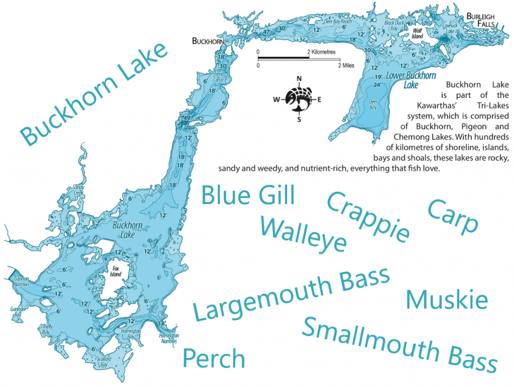 Although lakes on the more northern Precambrian Shield tend to be deep and rocky bottomed basins, the Kawartha Lakes—including Buckhorn Lake—are located on Paleozoic glacial deposits and have shallow basins of mostly flooded land. The deepest part of Buckhorn Lake, for example, is restricted to a small region by the dam at its most northern end. The remainder of this dendritic lake ranges from 1.8 to 3.6 metres, averaging 2.1 m. Bays and shoals on its southern and western shores are marshy, very shallow with a soft bottom and weedy.