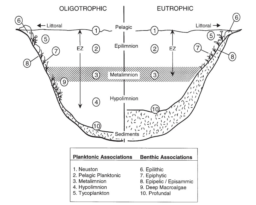 Eutrophic Lakes have high levels of biological productivity. Plants are abundant due to available nutrients such as phosphorus and nitrogen. Fauna initially increase with increased plant and algal production, but eventually reduce when algal blooms overcrowd the lake and deplete the oxygen through decomposition.