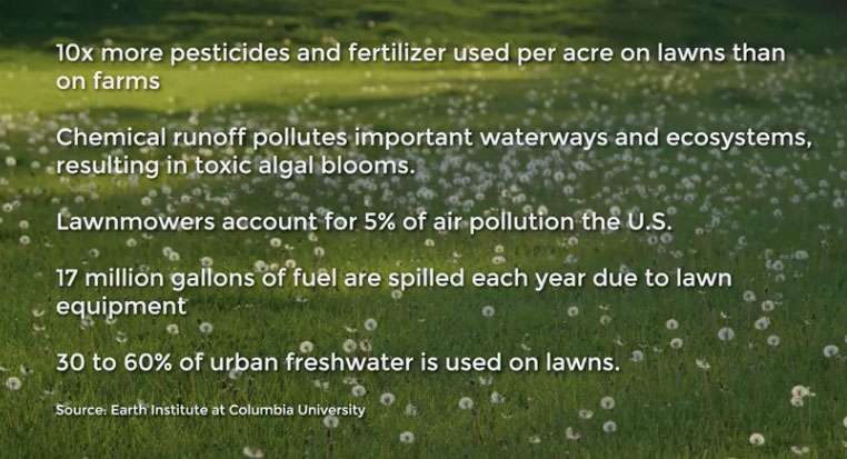 The runoff of fertilizers and pesticides we put on our lawns pollute surrounding bodies of water. Nutrients such as nitrogen and phosphorus contaminate nearby lakes and streams and encourage noxious growths of oxygen-choking and even toxic algae and macrophytes. The monoculture–without wildflowers, shrubs, dead wood and trees–is less than ideal for pollinators such as bees, butterflies and birds that help plants reproduce. Lawns also require huge amounts of water to maintain and result in air pollution, spilled fuel and overuse of fossil fuels for motorized lawnmowers.