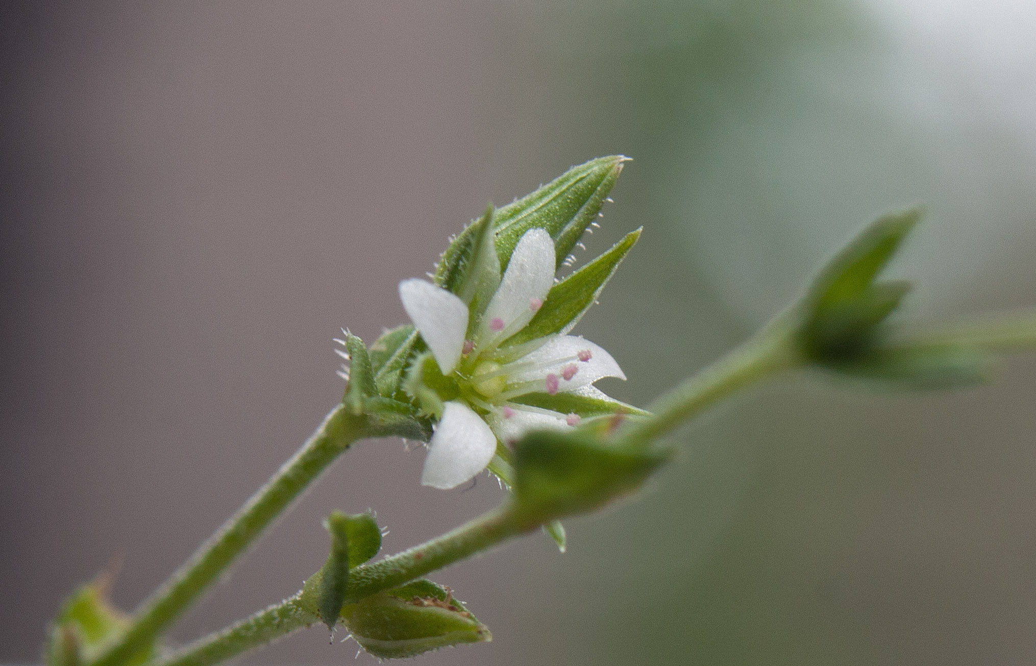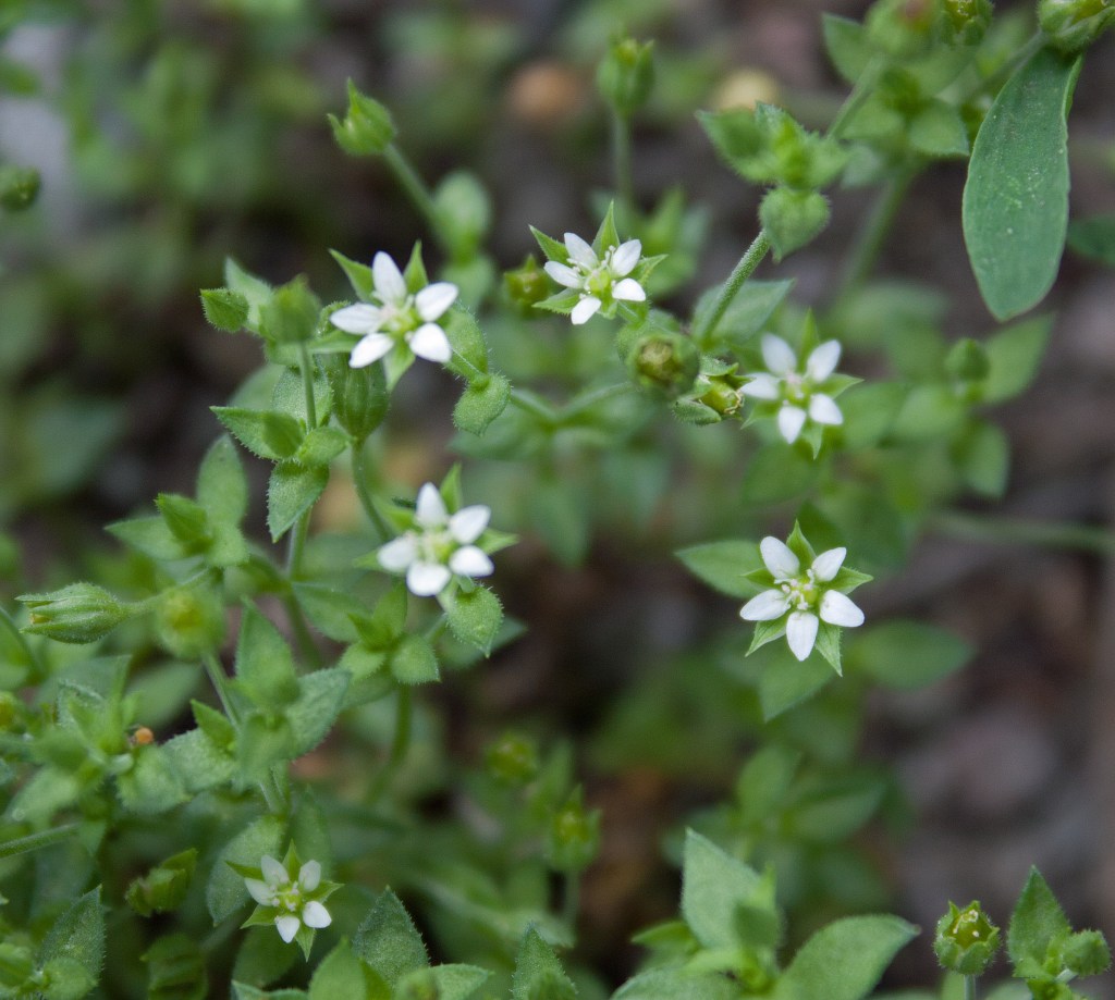 Thyme-leaved Sandwort (Arenaria serpyllifolia) is an edible plant with stunning tiny white 5-petal flowers; petals alternate with long green sepals, creating a ten-pointed star. A native of Europe and Asia, it grows in part shade and sun over disturbed sandy or gravelly soil, roadsides, waste areas as well as fields and lawns. According to Minnesota Wildflowers this tiny plant tends to inhabit areas that are weedy with other species and spreads through branching sprawling stems.