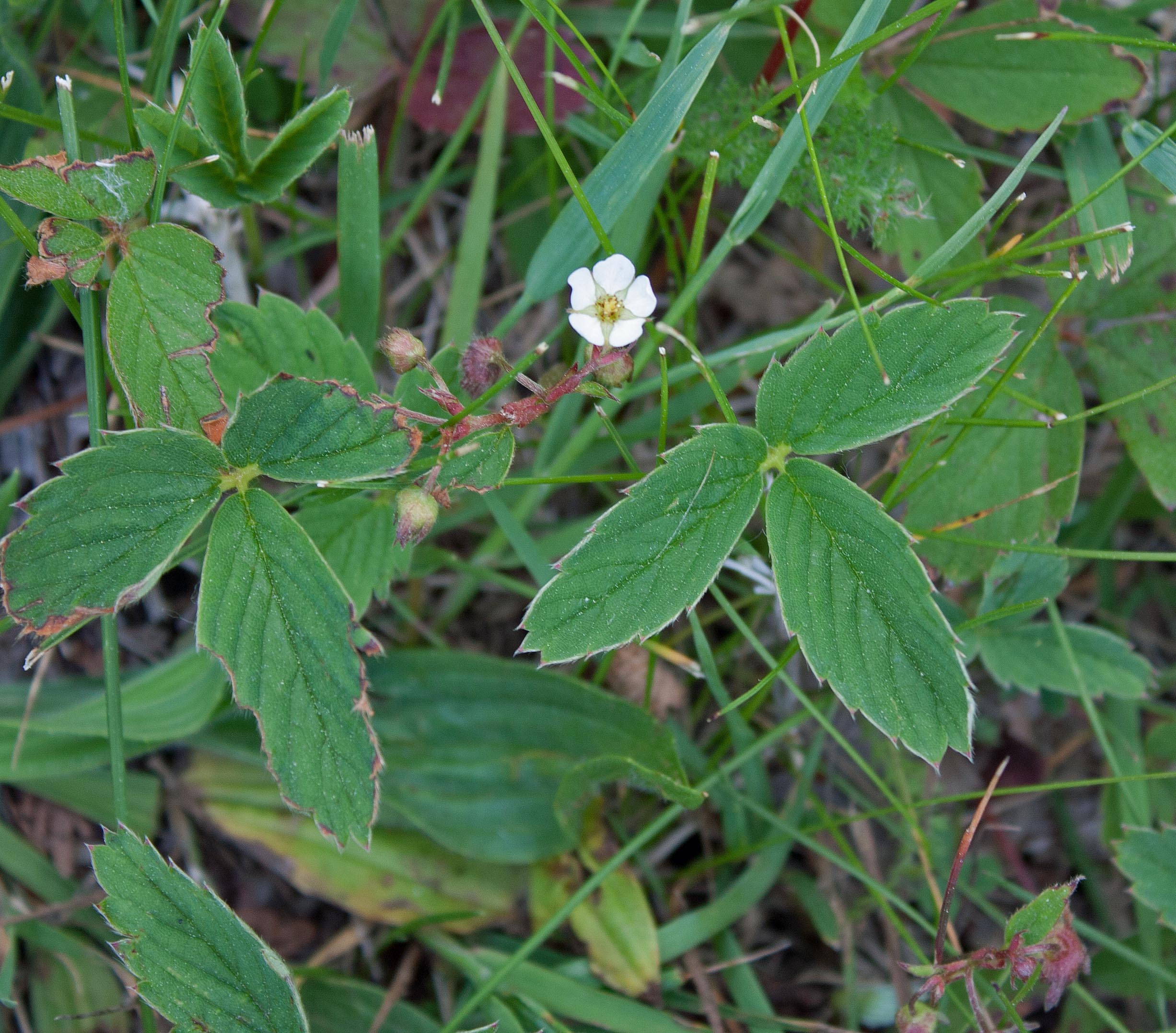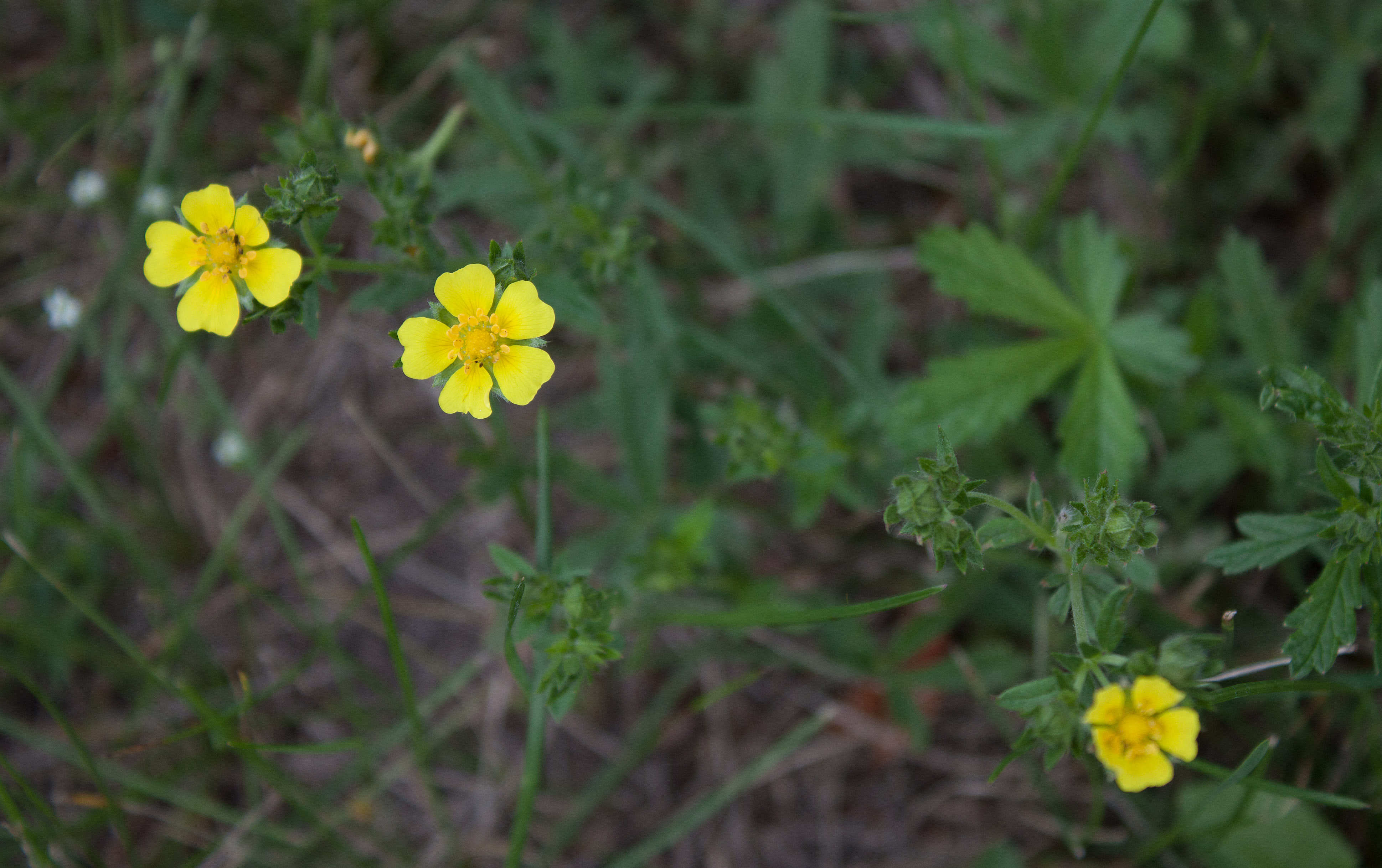 Flowers larger than the Silvery Cinquefoil rise from runners on separate stalks. Common in fields, open meadows, dry woods and unmanicured lawns, this Potentilla is also edible. Young shoots and leaves can be eaten as a pot herb or in a salad.